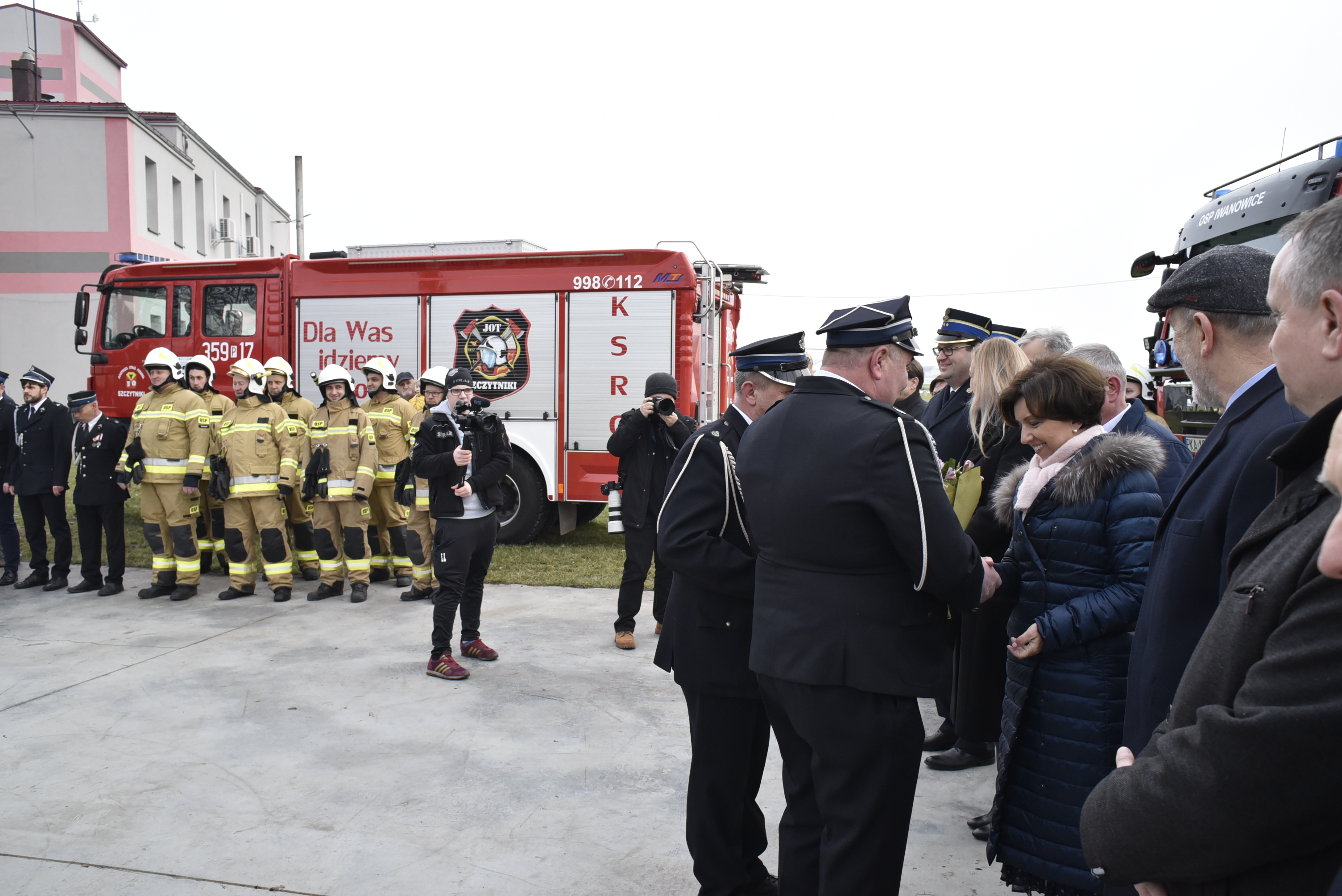 Klucze do auta przekazali: Minister Rodziny i Polityki Społecznej Pani Marlena Maląg, Poseł na Sejm Rzeczypospolitej Polskiej Pani Katarzyna Sójka, Poseł na Sejm Rzeczypospolitej Polskiej Pan Jan Mosiński, Poseł na Sejm Rzeczypospolitej Polskiej Pan Tomasz Ławniczak, Dyrektor Biura Poselskiego Ministra Jana Dziedziczaka Sekretarza Stanu w Kancelarii Prezesa Rady Ministrów Pan Wincenty Nowak, Dyrektor Biura Posła do Parlamentu Europejskiego Pani Andżeliki Możdżanowskiej Pani Anna Lis, Zastępca Wielkopolskiego Komendanta Wojewódzkiego bryg. Robert Natunewicz, Starosta Powiatu Kaliskiego Pan Krzysztof Nosal, Wójt Gminy Szczytniki Pan Marek Albrecht, Komendant Miejski PSP w Kaliszu st. bryg. Tomasz Polak. Poświęcenia nowego pojazdu dokonał ks. Paweł Jabłoński.