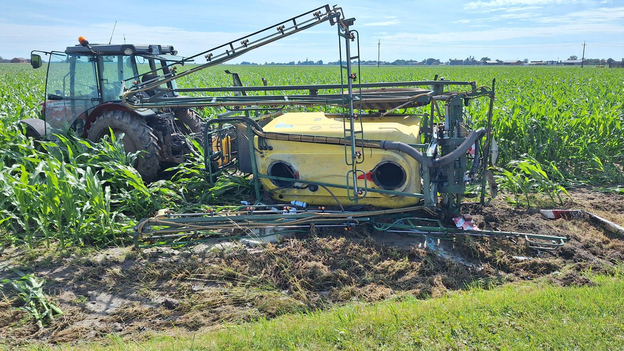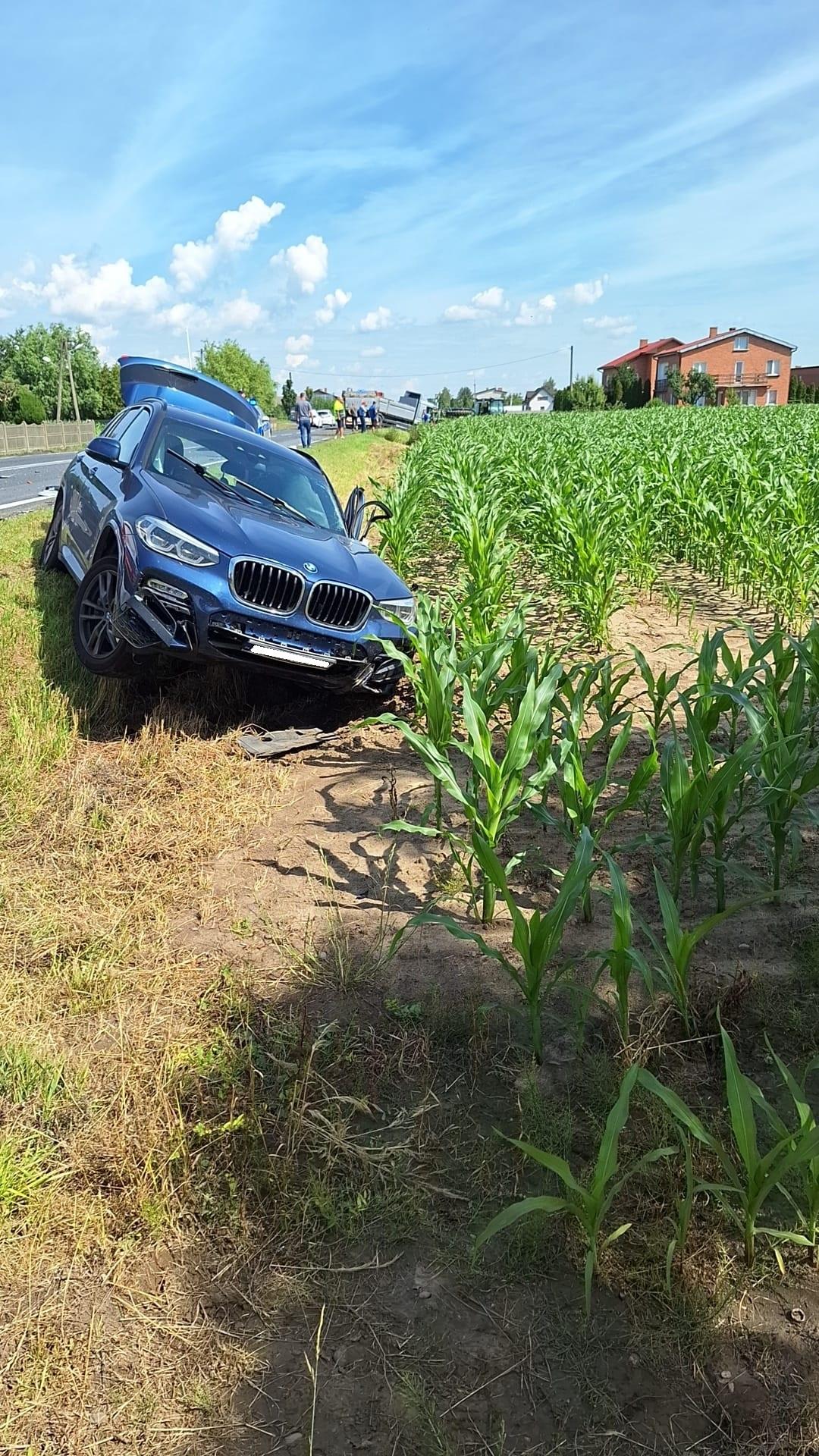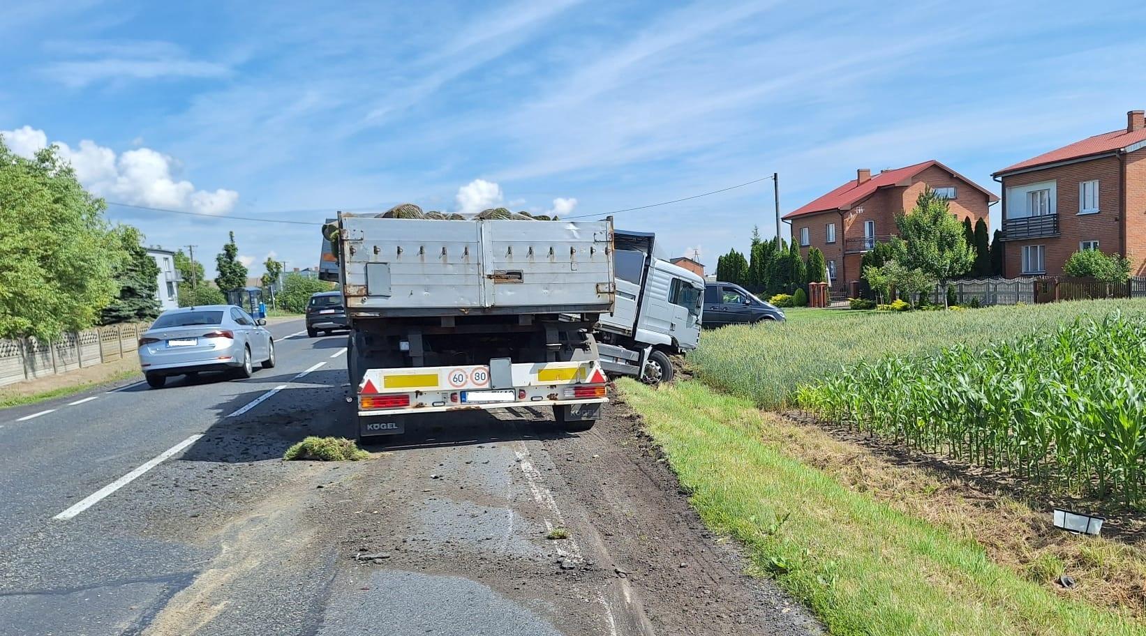 Po przybyciu zastępów straży pożarnej na miejsce zdarzenia stwierdzono, że doszło do zdarzenia trzech pojazdów, ciężarowego Mana z przyczepą, ciągnika rolniczego z opryskiwaczem oraz osobowego BMW. W wyniku zdarzenia obrażeń doznali kierujący ciągnikiem rolniczym i kierująca samochodem osobowym kobieta. Kierujący samochodem ciężarowym nie wymagał pomocy medycznej. Samochód ciężarowy znajdował się częściowo w rowie, ciągnik rolniczy z przewróconym opryskiwaczem stał w pobliskim polu kukurydzy, a BMW znajdowało się również w rowie.