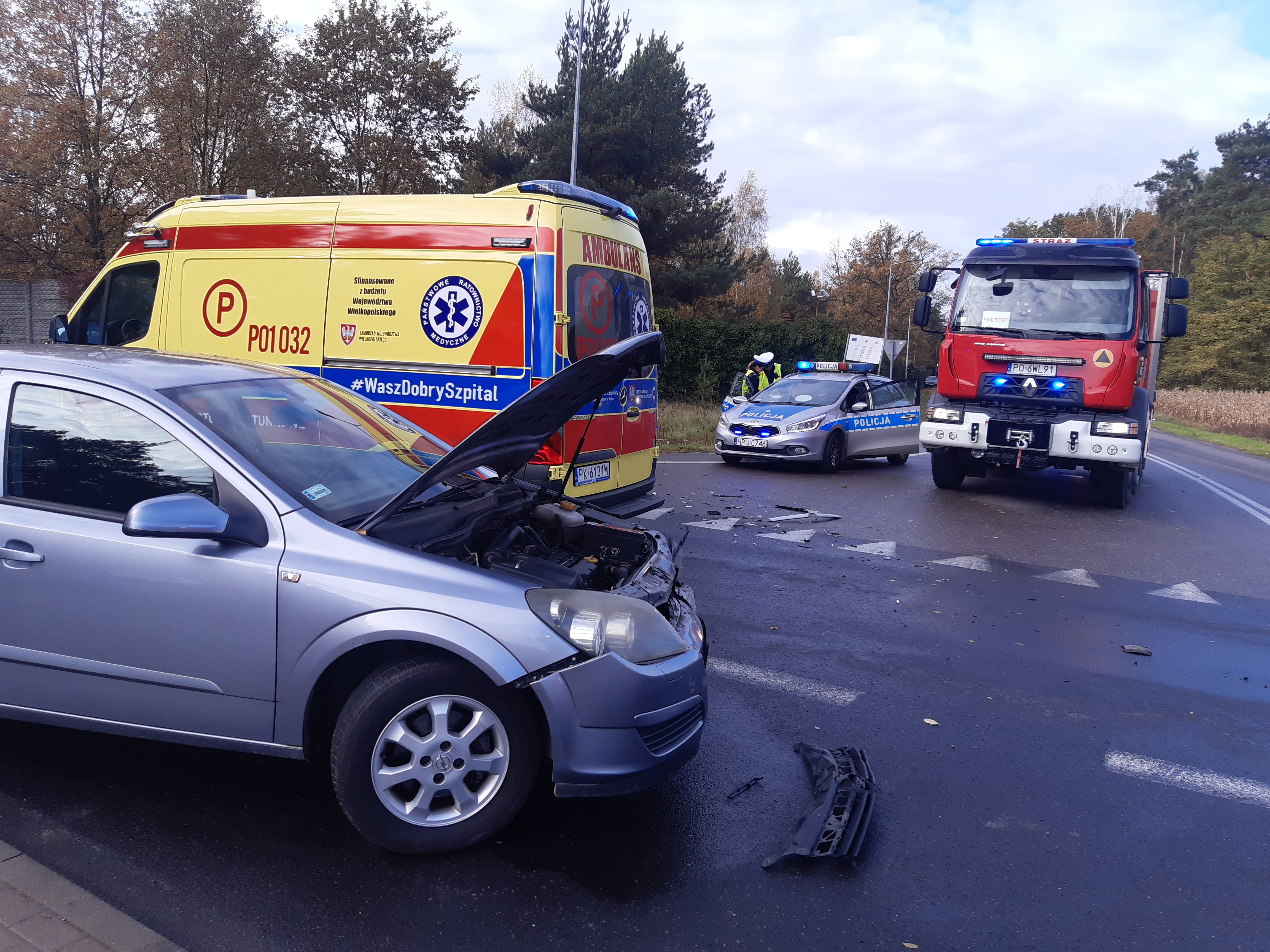 W dniu 25.10.2022r. do stanowiska kierowania Komendanta Miejskiego PSP w Kaliszu wpłynęła informacja o wypadku do którego doszło w miejscowości Szałe na skrzyżowaniu ulicy Kaliskiej i Źródlanej. Po dojeździe na miejsce zdarzenia pierwszych zastępów stwierdzono, że doszło do zderzenia dwóch samochodów osobowych w wyniku czego poszkodowane zostały dwie osoby. Działania strażaków polegały na zabezpieczeniu miejsca zdarzenia. Następnie udzielono pomocy medycznej osobom poszkodowanym, jedna z osób uskarżała się na ból klatki piersiowej natomiast druga z nich cierpiała na mocny ból głowy. Ranne osoby zostały zaopatrzone przez strażaków i przekazane przybyłemu na miejsce pogotowiu. W dalszej kolejności swoje działania prowadziła policja po ich zakończeniu uprzątnięto pozostałości oraz udrożniono skrzyżowanie. W działaniach udział brały zastępy z JRG 1 Kalisz, OSP Opatówek, OSP Tłokinia Wielka, Pogotowie oraz Policja.