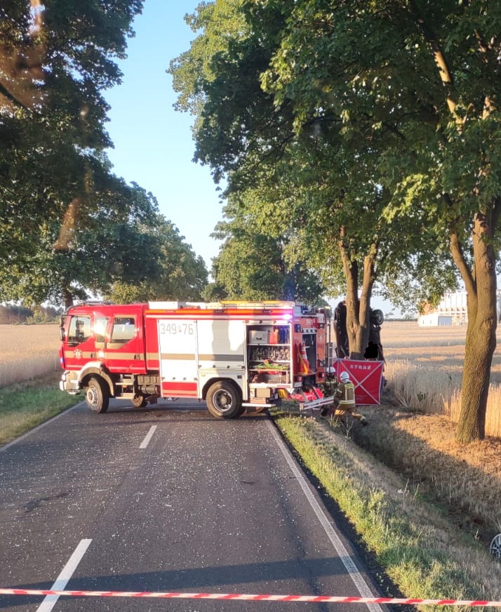 W dniu 16.07.2023 do Miejskiego Stanowiska Kierowania w Kaliszu około godz. 20 wpłynęła informacja o wypadku w miejscowości Sierzchów. Do zdarzenia zadysponowano trzy jednostki PSP oraz trzy jednostki OSP. Po przybyciu na miejsce zdarzenia pierwszego zastępu ustalono, że samochód osobowy poruszający się z miejscowości Koźminek w kierunku miejscowości Sierzchów z nieustalonych przyczyn wypadł z jezdni i uderzył w drzewo. Samochód został zastany stojący pionowo połączony dachem z konarem drzewa skierowany przodem w kierunku ziemi. Samochodem podróżowała jedna osoba, która w wyniku tego zdarzenia poniosła śmierć na miejscu. Przeszukano dokładnie cały pojazd i teren wokół zdarzenia - nie stwierdzono więcej osób poszkodowanych. Wrak samochodu został zabrany przez pomoc drogową. Działania zakończono.