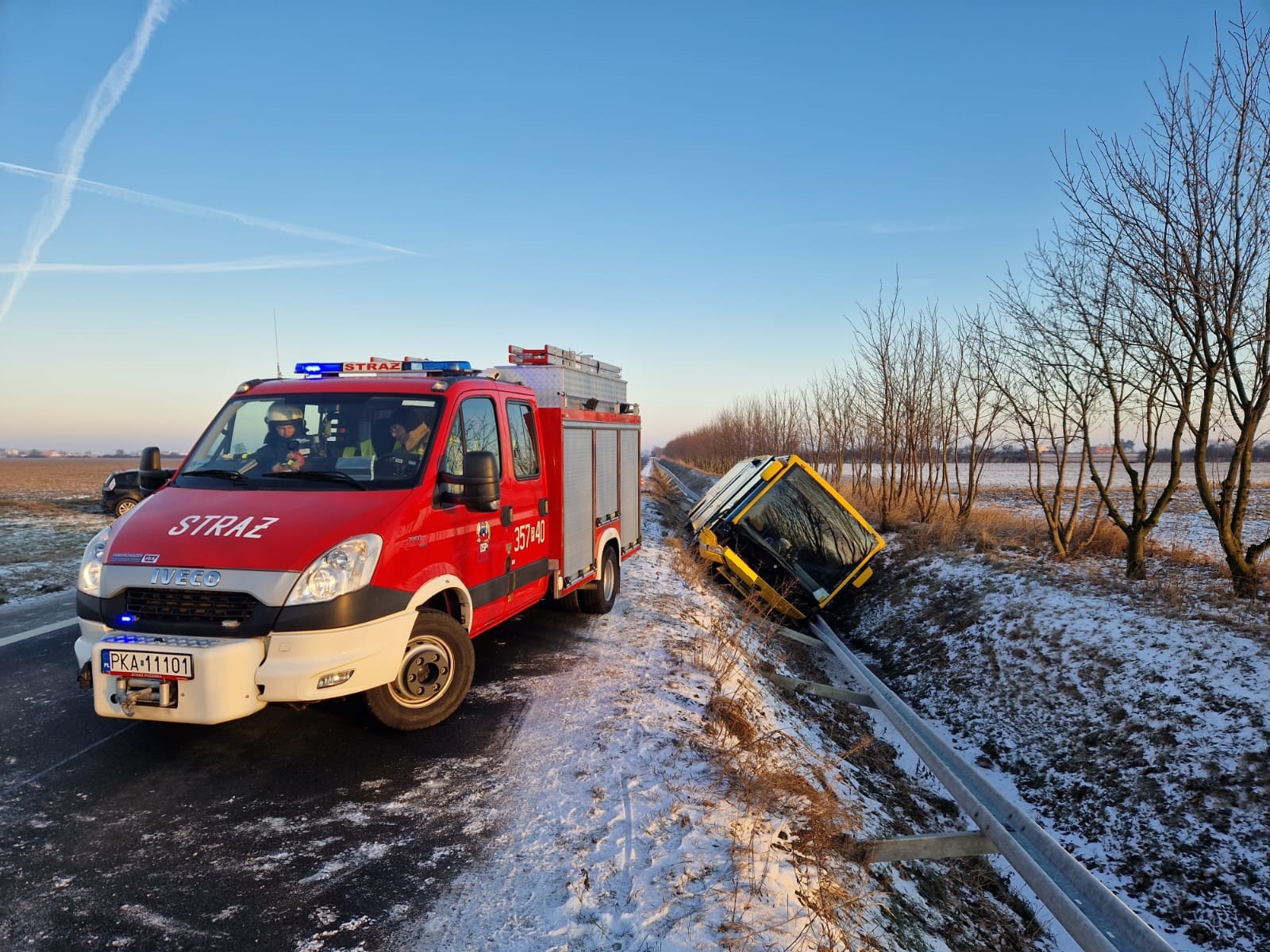 17 stycznia o godz. 07:28 dyżurny SKKM w Kaliszu odebrał zgłoszenie, że w miejscowości Borków Stary ma miejsce zdarzenie drogowe z udziałem autobusu. Na miejsce zdarzenia zostały zadysponowane zastępy z JRG 1 w Kaliszu, OSP Czartki oraz OSP Tykadłów, Zespół Ratownictwa medycznego oraz Policja. Na miejscu zdarzenia stwierdzono, że autobus na prostym odcinku drogi zjechał do rowu. W pojeździe podróżowało 11 osób: jedna osoba poszkodowana została zabrana przez ZRM do szpitala, jedna odmówiła udzielenia pomocy, pozostałe nie wymagały udzielenia pomocy medycznej. Na czas prowadzenie działań ratowniczych ruch w miejscu zdarzenia odbywał się wahadłowo. Po wyciągnięciu autobusu z rowu i odholowaniu przez Pomoc Drogową przywrócono ruch drogowy w obu kierunkach.