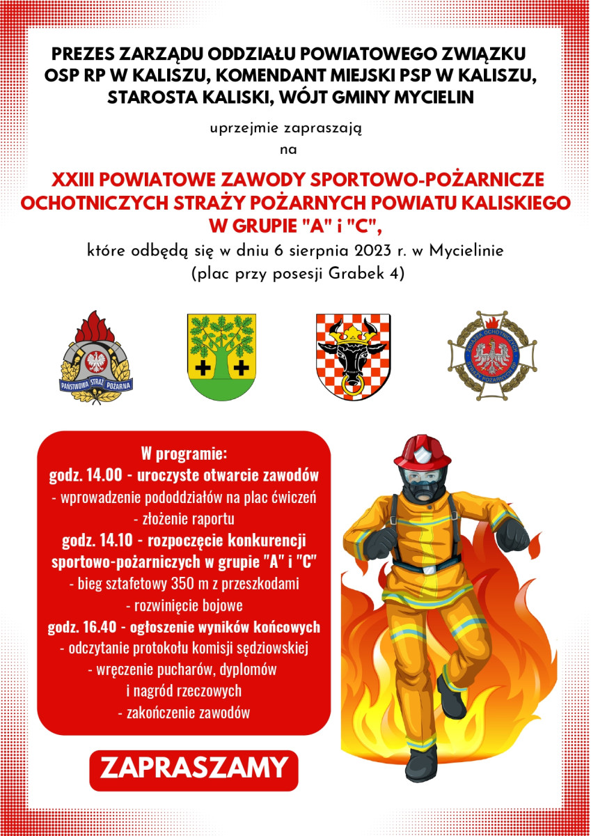 XXIII POWIATOWE ZAWODY SPORTOWO-POŻARNICZE OCHOTNICZYCH STRAŻY POŻARNYCH POWIATU KALISKIEGO W GRUPIE "A" i "C", które odbędą się w dniu 6 sierpnia 2023 r. w Mycielinie (plac przy posesji Grabek 4)
