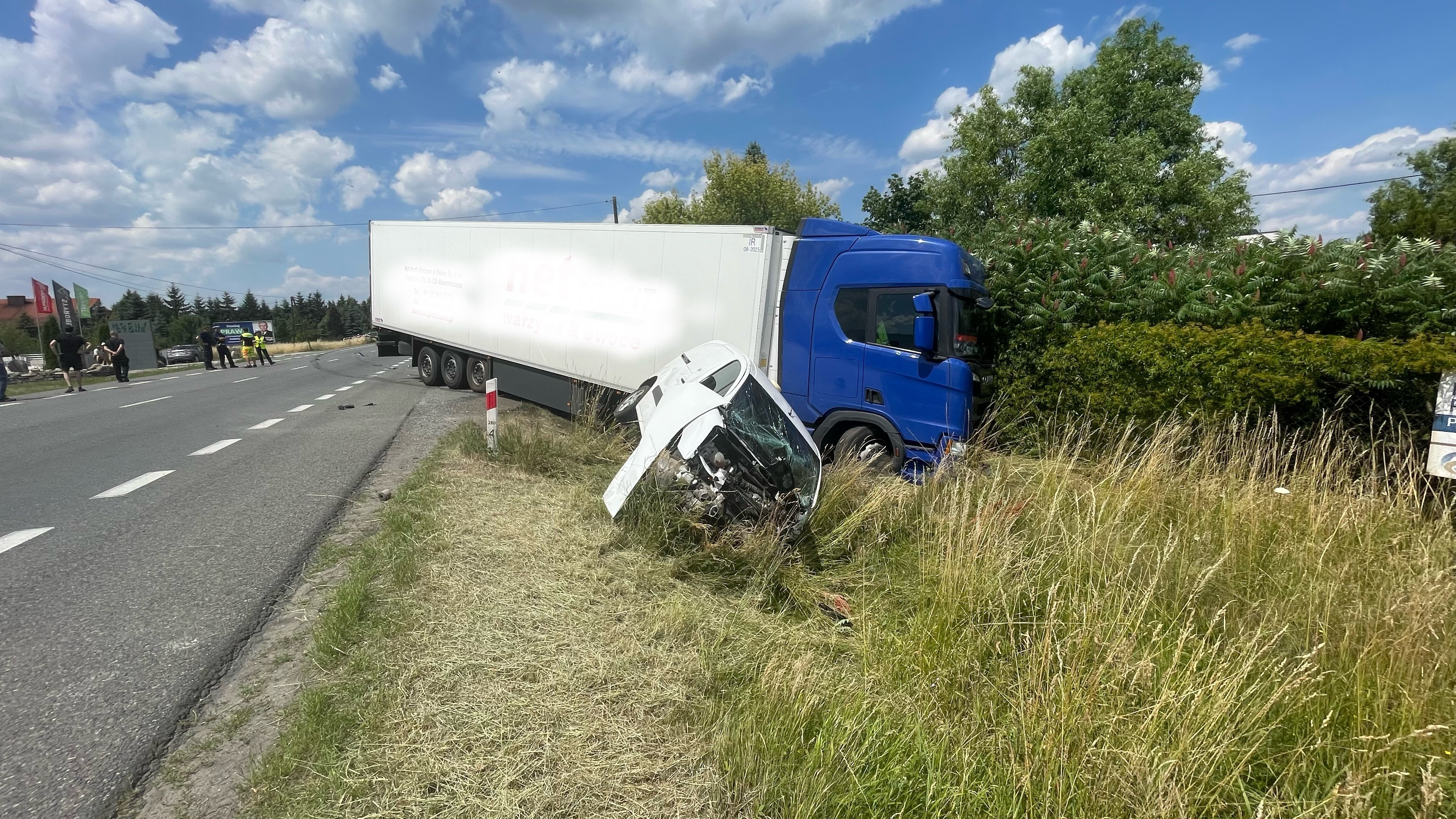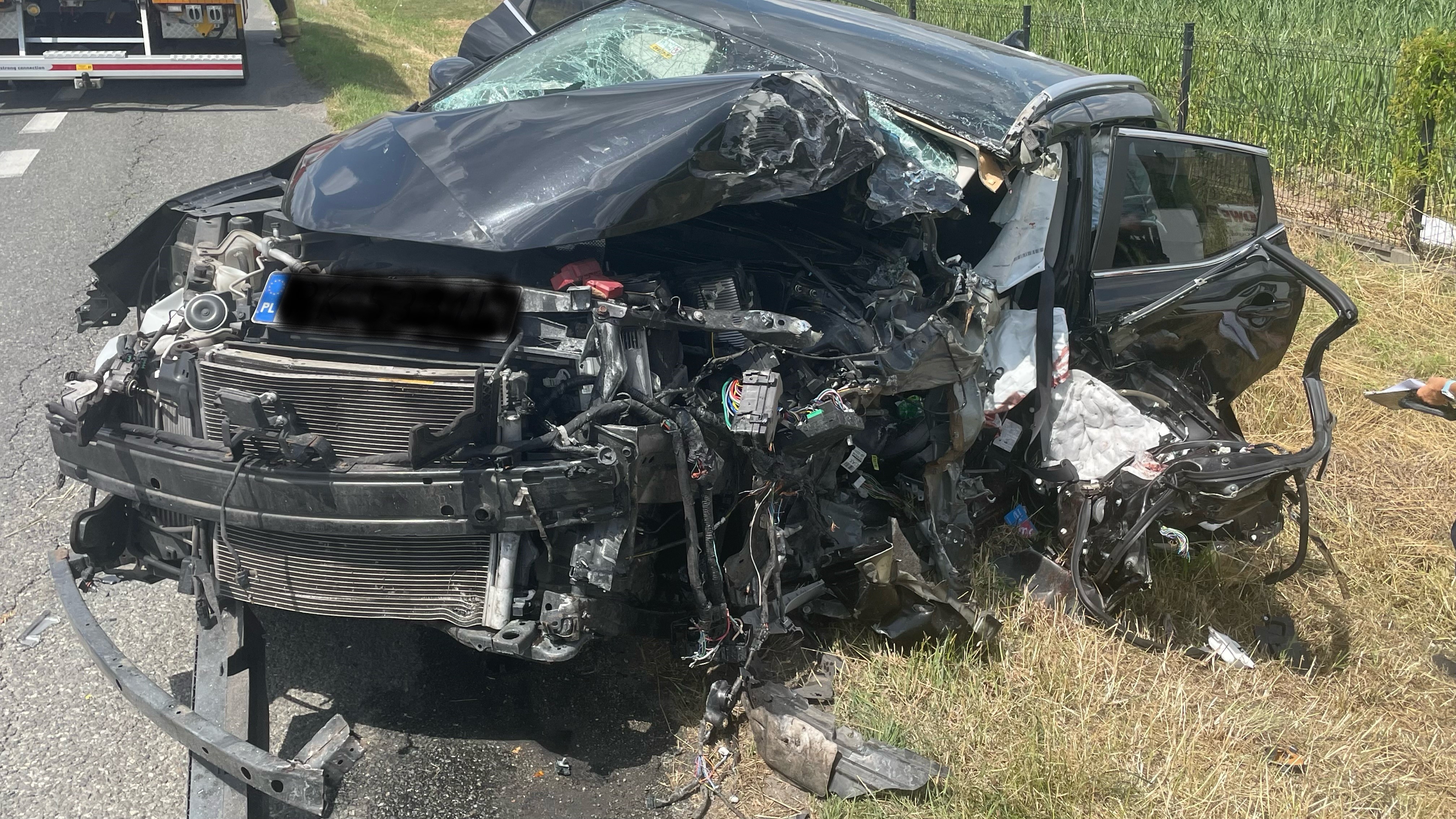 W dniu 05.07.2023 r. około godziny 11:18 do Miejskiego Stanowiska Kierowania w Kaliszu wpłynęła informacja o wypadku z udziałem samochodu ciężarowego oraz dwóch samochodów osobowych. Działania straży polegały na zabezpieczeniu miejsca zdarzenia poprzez całkowite zablokowanie jezdni oraz zabezpieczenie lądowiska dla Lotniczego Pogotowia Ratowniczego. Przy użyciu narzędzi hydraulicznych przystąpiono do ewakuacji nieprzytomnej kobiety kierującej czarnym pojazdem osobowym. W tam samym czasie Zespół Ratownictwa Medycznego udzielał kobiecie pomocy medycznej. Ewakuowana poszkodowana została przekazana Lotniczemu Pogotowiu Ratowniczemu, który przetransportował ją do szpitala. Kobieta podróżowała z dwoma córkami, którym również została udzielna pomoc medyczna. Kierująca drugim samochodem osobowym biorącym udział w zdarzeniu w chwili przybycia straży znajdowała się na terenie posesji znajdującej się obok drogi. Kobiecie natychmiast zostało udzielono KPP, skarżyła się na ból klatki piersiowej, obojczyka oraz duszności. Kierujący samochodem ciężarowym nie wymagał pomocy medycznej. Wszystkie osoby poszkodowane zostały zabrane na dalszą obserwację do szpitali. Na czas działań na drodze krajowej nr 12 policja zorganizowała objazd przez sąsiednie miejscowości. Po zakończeniu czynności przez policję usunięto pozostałości po wypadku z drogi, ruch na drodze został przywrócony wahadłowo. Na miejsce zdarzenia przybyła Grupa Operacyjna Komendanta Miejskiego Państwowej Straży Pożarnej w Kaliszu pod dowództwem Zastępcy Komendanta Miejskiego Państwowej Straży Pożarnej w Kaliszu st. kpt. Damiana Knopa. Samochody osobowe zabrane zostały przez pomoc drogową. Działania straży zakończono, na miejscu pozostała policja która zabezpieczała miejsce zdarzenia do momentu usunięcia samochodu ciężarowego z rowu.