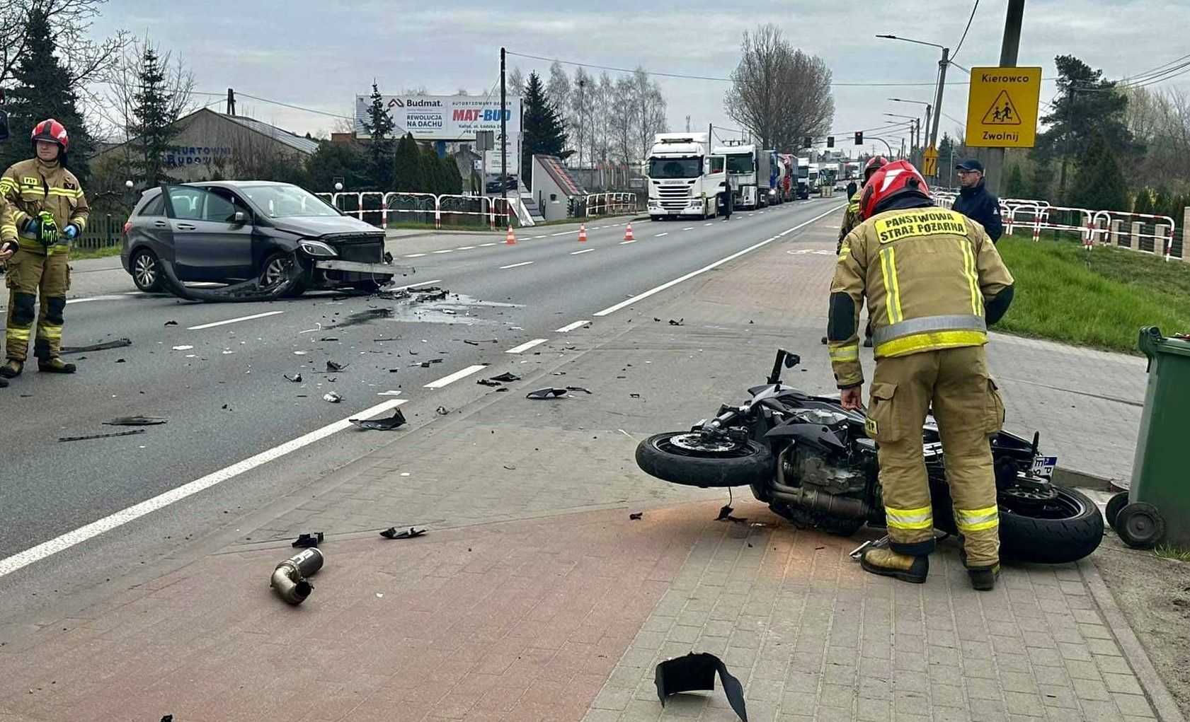 Po przybyciu na miejsce zdarzenia stwierdzono, że doszło do zdarzenia drogowego, w którym udział brały samochód osobowy oraz motocykl. Samochodem osobowym podróżowały dwie osoby, które znajdowały się na zewnątrz pojazdu i nie wymagały pomocy medycznej, natomiast motocyklem podróżowała jedna osoba, znajdowała się ona obok motocykla w pozycji półsiedzącej, w pełni przytomna, jednakże uskarżająca się na ogólne stłuczenia. Pojazdy biorące udział w zdarzeniu znajdowały się na jezdni oraz chodniku, droga całkowicie zablokowana.