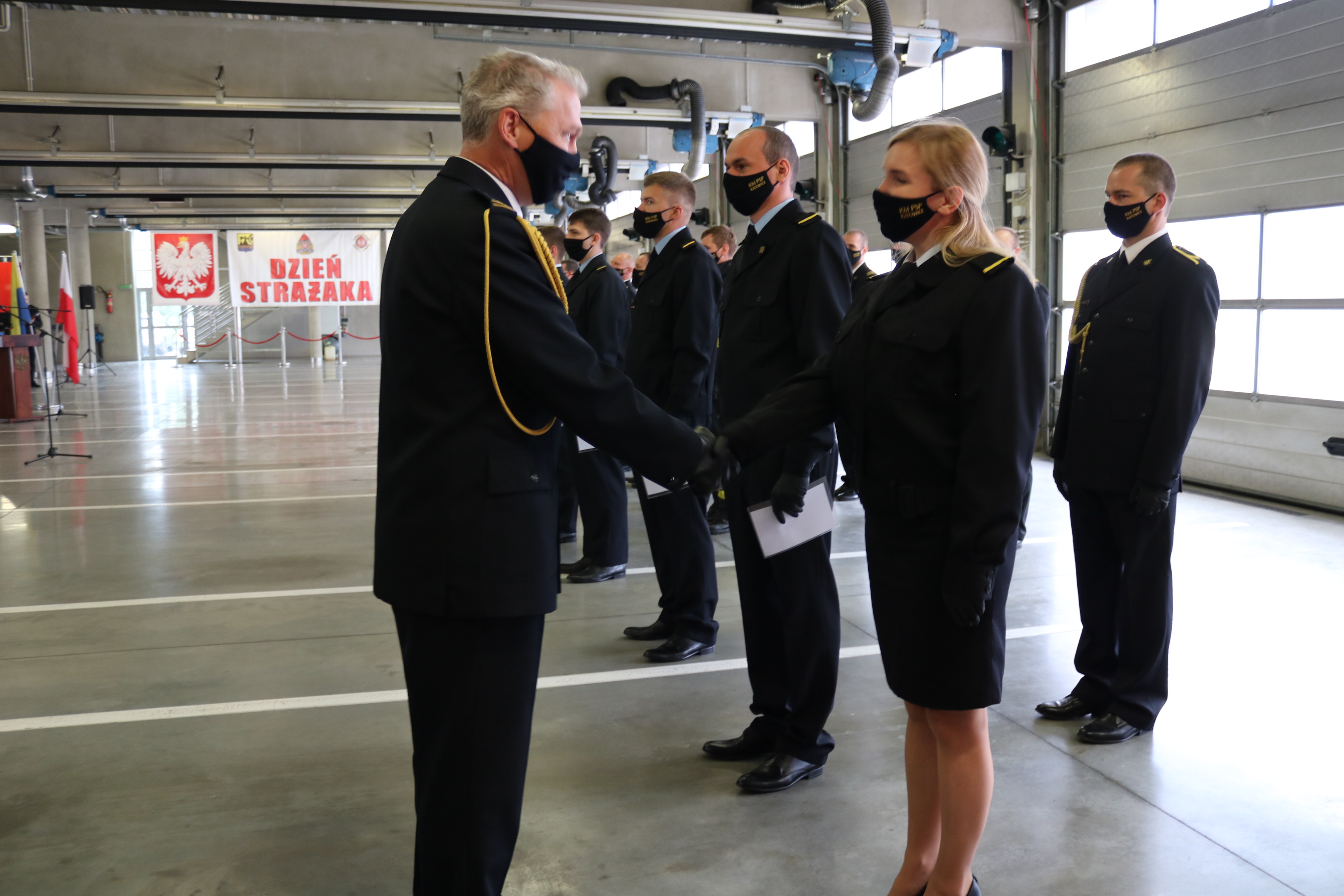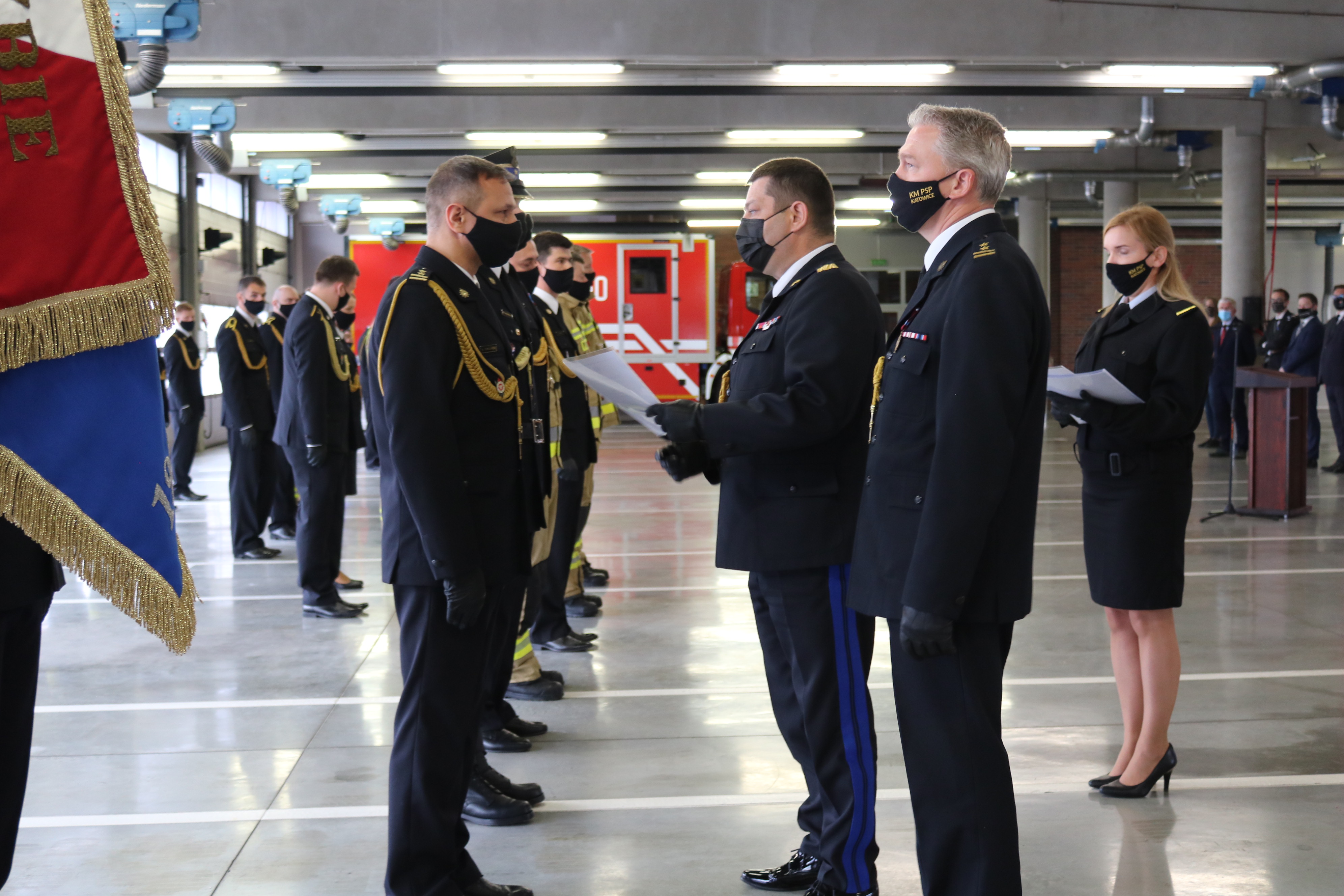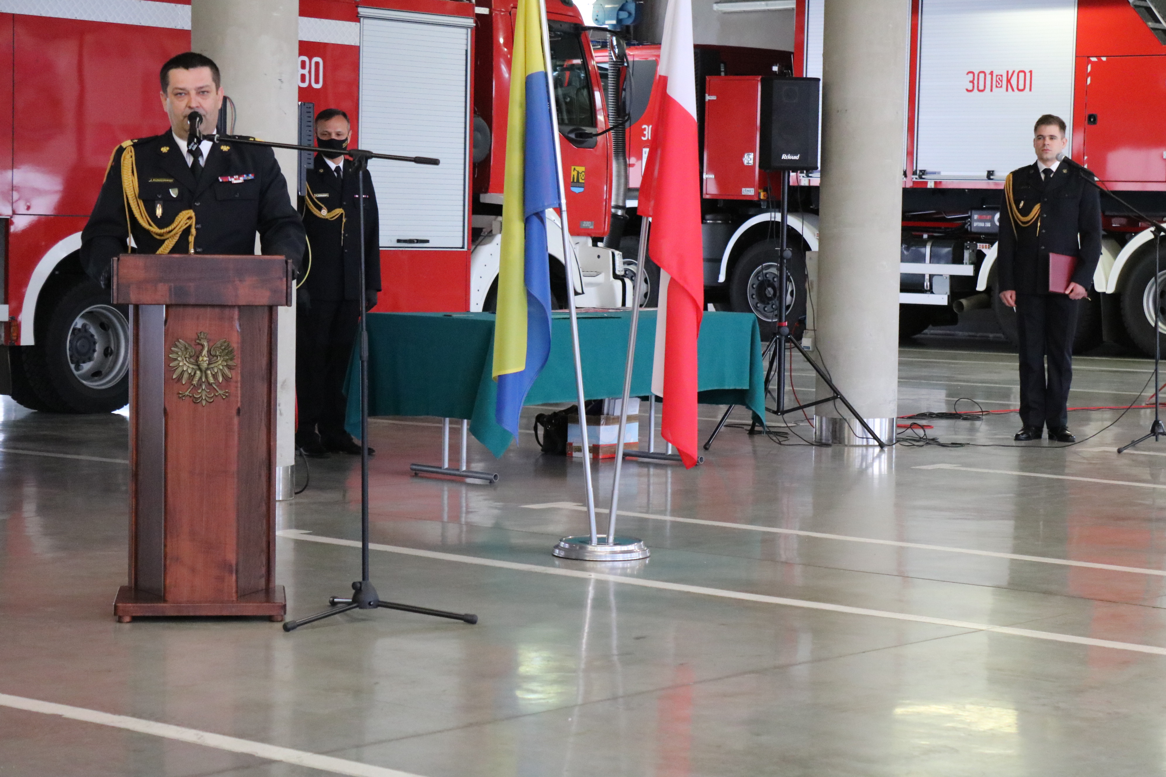 Śląski Komendant Wojewódzki PSP nadbrygadier Jacek Kleszczewski również serdecznie podziękował przedstawicielom władz samorządowych za przybycie i wsparcie dla straży pożarnej oraz druhom OSP za zaangażowanie. Podkreślił ważną i niebezpieczną rolę Ochotniczej Straży Pożarnej i Państwowej Straży Pożarnej w walce z pandemią koronawirusa. Na koniec wystąpienia pogratulował awansowanym i wyróżnionym funkcjonariuszom. Życzył strażakom wszystkiego dobrego oraz „wsparcia św. Floriana”.