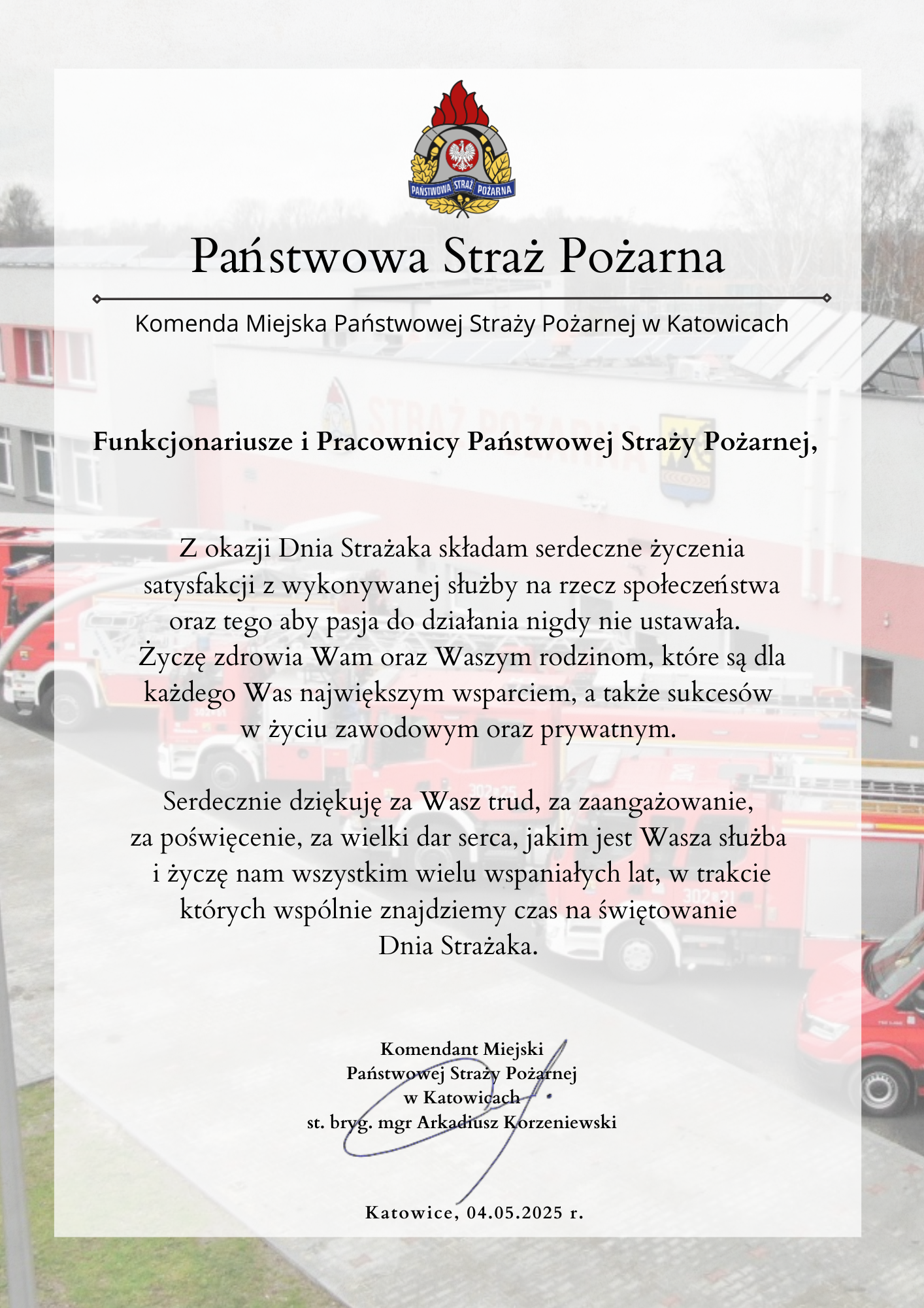Życzenia Komendanta Miejskiego PSP w Katowicach z okazji dnia strażaka