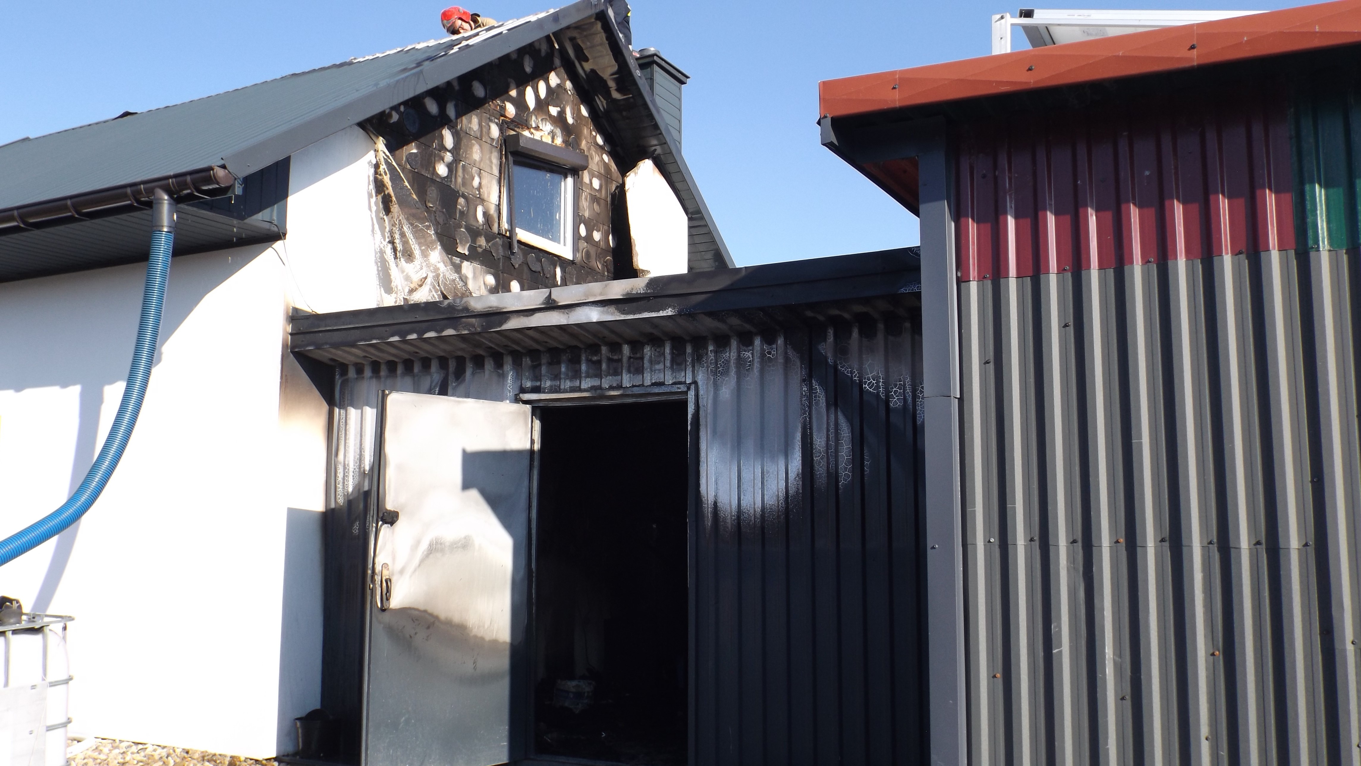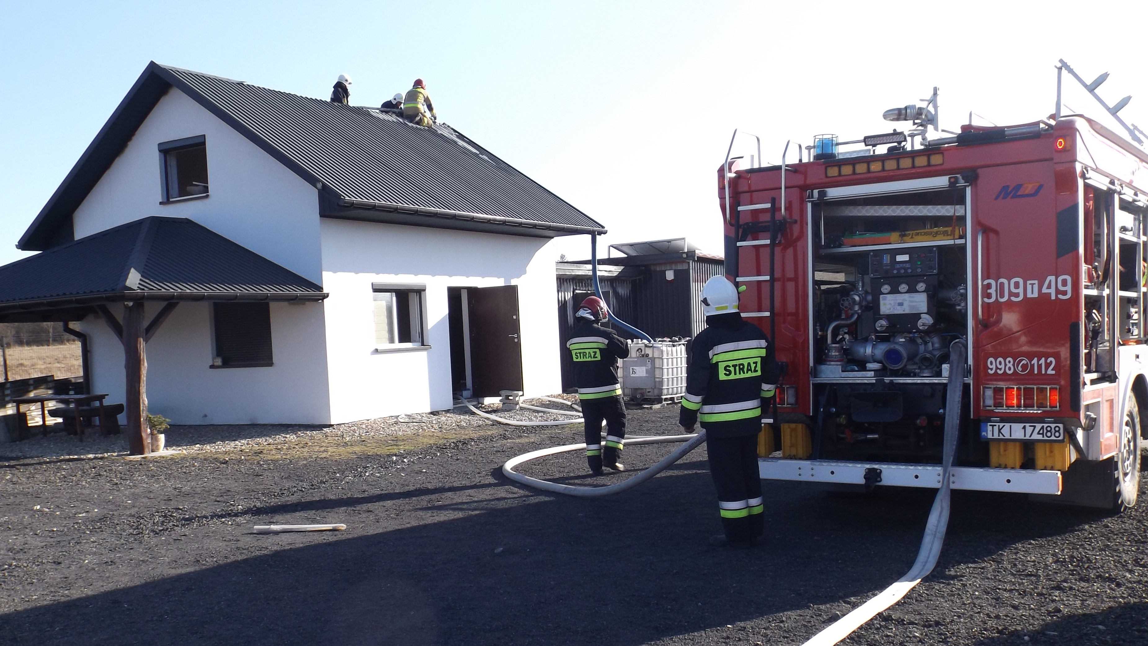 Budynek, gdzie wybuchł pożar składał się z części gospodarczej i socjalnej, a ogień objął jedno pomieszczenie w części gospodarczej i fragment więźby dachowej na części socjalnej. Ratownicy zabezpieczyli miejsce działania i rozpoczęli gaszenie ognia wykorzystując 3 prądy wody. Obiekt zasilany był w energię elektryczną z zamontowanych na gruncie paneli fotowoltaicznych, które zostały odłączone i zabezpieczone. Strażacy wykonali również niezbędne demontaże w celu dotarcia do ognisk pożaru. Po ugaszeniu ognia budynek sprawdzono kamerą termowizyjną i detektorem wielogazowym wykluczając ewentualne zagrożenia.