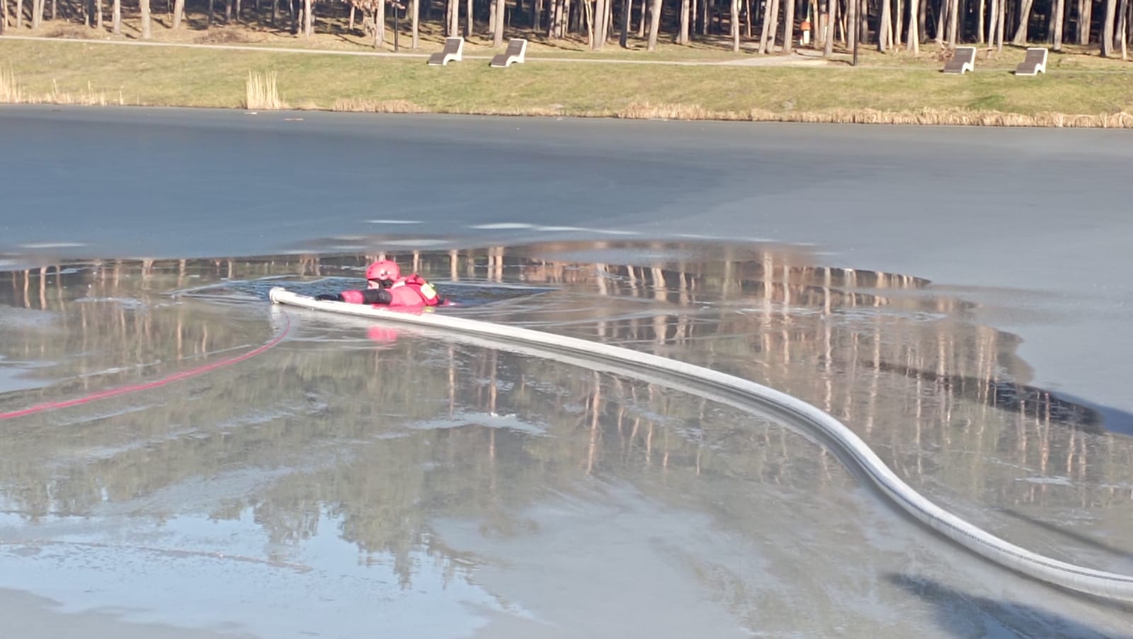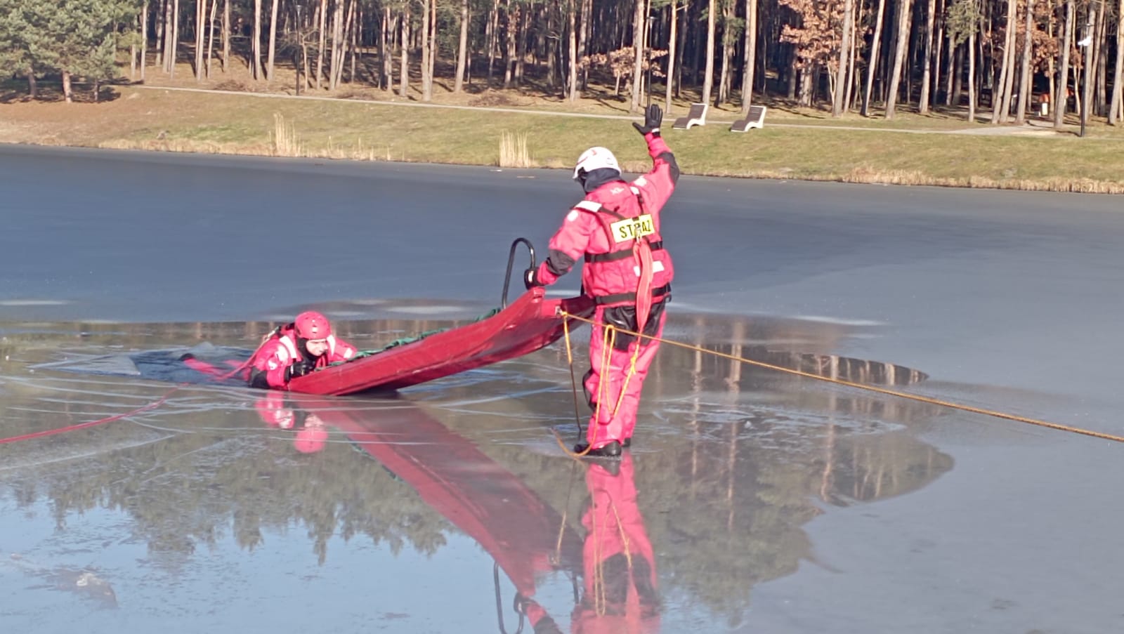 Korzystając z okazji strażacy apelują: ślizgawka na zamarzniętym stawie to bardzo zły pomysł – korzystajmy lodowisk tylko zorganizowanych i odpowiednio przygotowanych. Jeśli jednak znajdziemy się w styuacji i załamie pod nami lód, zachowajmy spokój i unikajmy gwałtownych ruchów. Za wszelką cenę starajmy się utrzymać na powierzchni rozkładając szeroko ręce. Próbujmy wydostać się na taflę lodu, a gdy nam się to uda kierujemy się do brzegu w pozycji leżącej aby jak najbardziej rozłożyć obciążenie i najważniejsze: cały czas wzywamy pomocy. Gdy jesteśmy świadkiem takiego zdarzenia musimy przede wszystkim zadbać o własne bezpieczeństwo, bo jesteśmy jedynym ratunkiem dla poszkodowanego. Wezwijmy pomoc i zaangażujmy do akcji osoby postronne. Jeśli jest to możliwe i bezpieczne spróbujmy podać szalik, sanki, linę czy mocną gałąź osobie w wodzie i starajmy pomóc jej wydostać się na lód. Poszkodowanemu, który wydostał się na brzeg zapewnijmy w miarę możliwości komfort termiczny i czekajmy z nim na wezwaną pomoc.