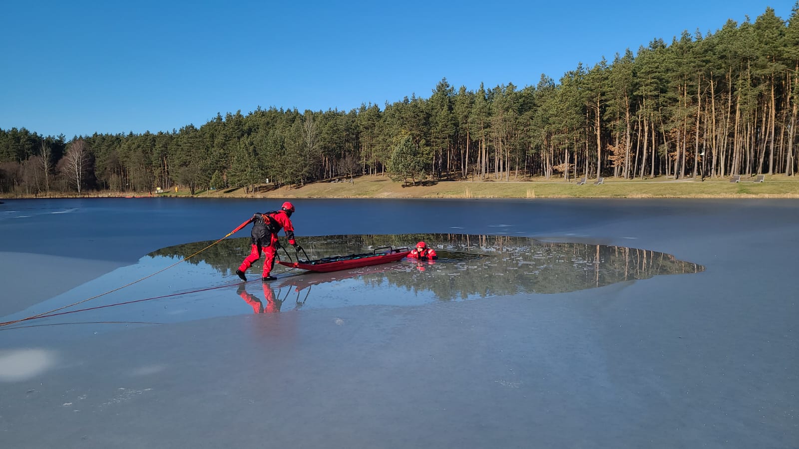 Takie założenie jest na stałe wpisane w kalendarz doskonalenia zawodowego strażaków i zbiega się z rozpoczynającymi w naszym województwie feriami zimowymi dla dzieci i młodzieży szkolnej. Podczas działań na tafli lodowej ratownicy trenują podejmowanie z wody osoby poszkodowanej pod którą załamał się kruchy lód przy użyciu sani lodowych. To też okazja do utrwalenia sobie sposobów poruszania się i asekuracji przy tego typu akcjach ratowniczych. Ćwiczenia są nie tylko doskonałym kompendium wiedzy niezwykle przydatnej przy ratowaniu ludzi czy zwierząt z przerębli, są także bardzo widowiskowe i niejednokrotnie skupiają ciekawych obserwatorów na brzegach zamarzniętych zbiorników wodnych.