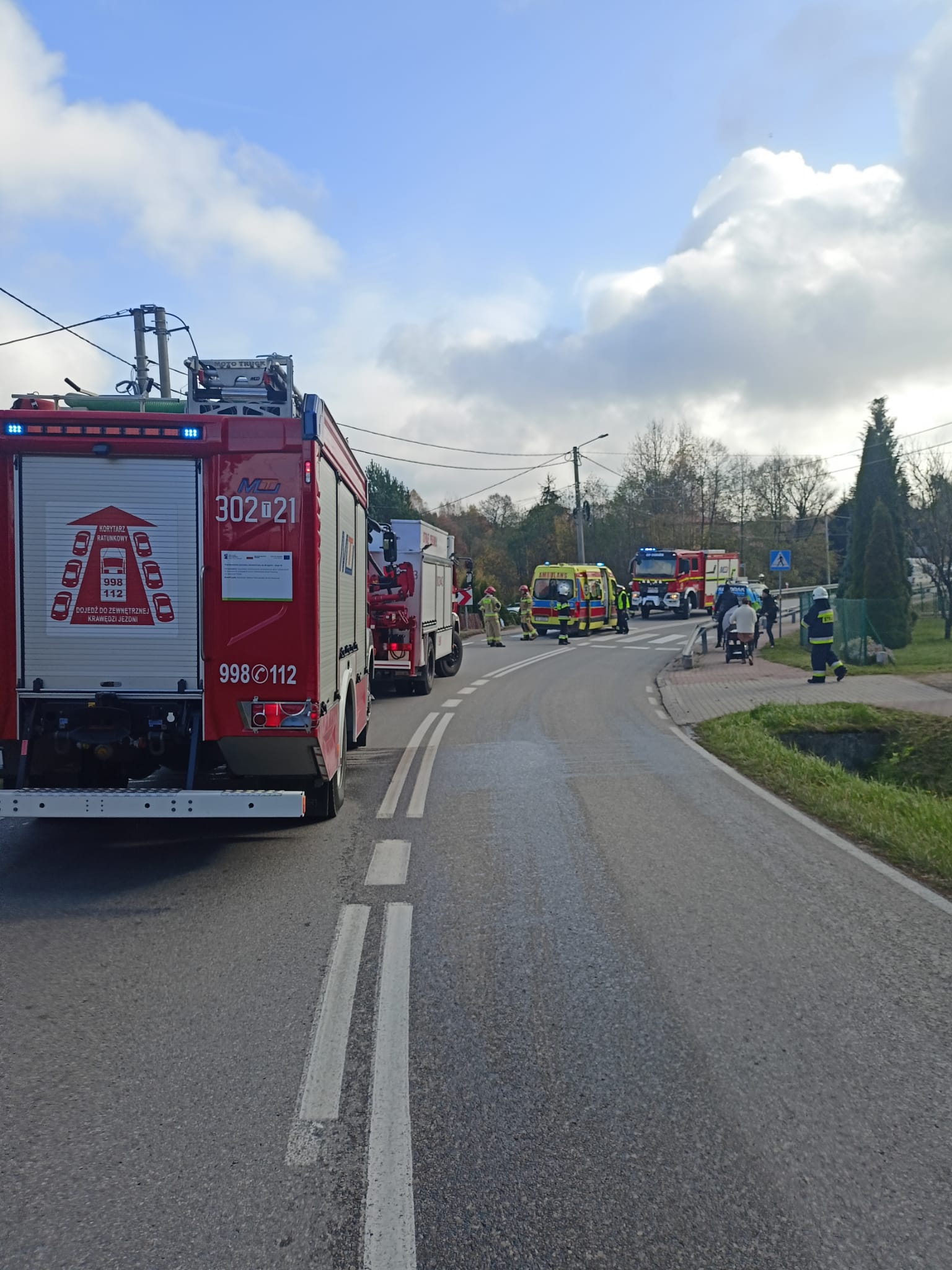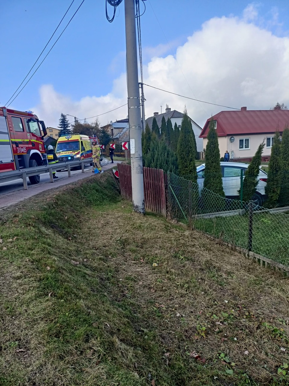 Na drodze wojewódzkiej numer 750 samochód osobowy marki Hyundai wypadł z jezdni, i niszcząc fragment drewnianego odrodzenia znalazł się na terenie prywatnej posesji. Autem podróżował jedynie kierowca, który samodzielnie opuścił pojazd i czekał na służby ratownicze. Strażacy, po zabezpieczeniu miejsca zdarzenia odłączyli zasilanie z akumulatora w uszkodzonym aucie, kierowali ruchem i jednocześnie wdrożyli procedury kwalifikowanej pierwszej pomocy w stosunku do kierującego. Zespół Ratownictwa Medycznego po przybyciu przejął opiekę nad poszkodowanym, a po przebadaniu pozostawił go na miejscu zdarzenia.