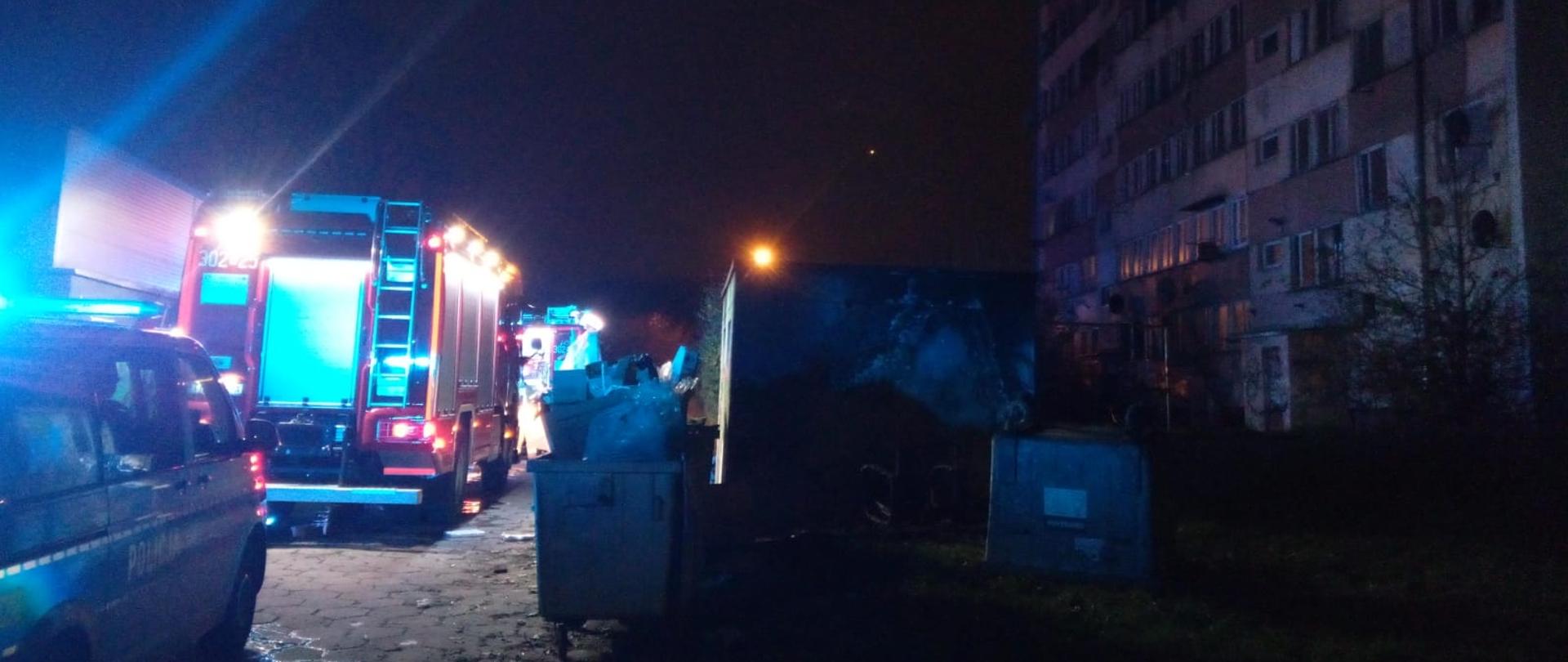 Tym razem pożar wybuchł w pomieszczeniach na parterze budynku i w chwili dojazdu strażaków gęsty dym wydobywał się z okien płonącego mieszkania oraz zadymione zostały korytarze i klatki schodowe. Strażacy podali 2 prądy wody w celu ugaszenia pożaru. Jednocześnie zabezpieczeni w aparaty ochrony układu oddechowego przeszukiwali mieszkanie. Nikogo nie znaleziono. Po ugaszeniu ognia przewietrzono i oddymiono ciągi komunikacyjne poszukując ewentualnych osób poszkodowanych. Na 4 piętrze znaleziono mężczyznę, który nie był wstanie sam opuścić budynku. Strażacy bezpiecznie ewakuowali go na zewnątrz i przekazali pod opiekę Zespołu Ratownictwa Medycznego. Na zakończenie mieszkanie sprawdzono kamerą termowizyjną i urządzeniem pomiarowym nie znajdując żadnych zarzewi ognia ani niebezpiecznych gazów pożarowych.