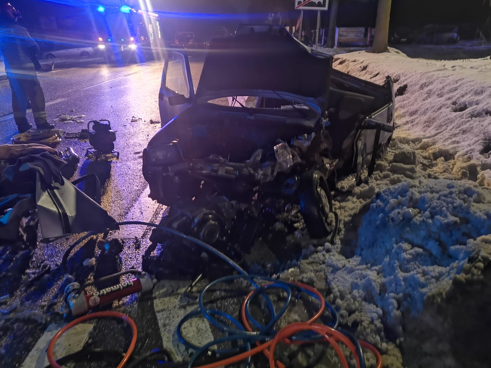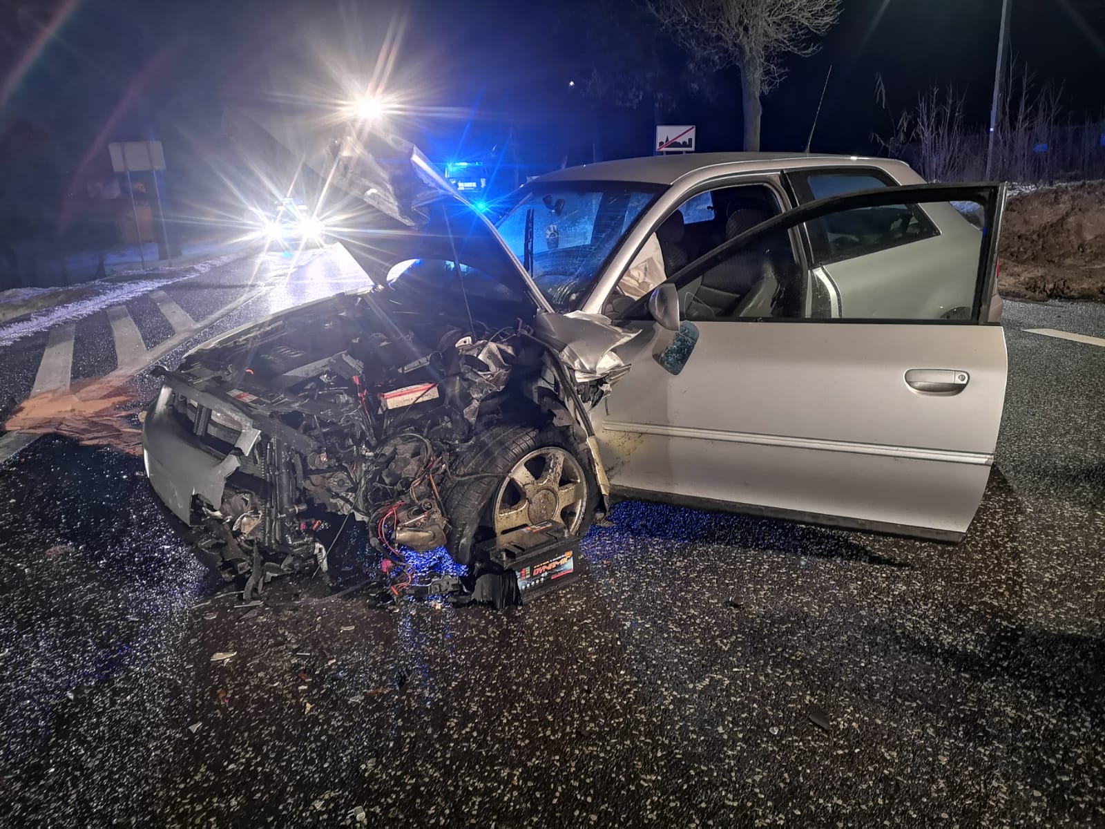 Na drodze krajowej numer 74 zderzyły się dwa samochody osobowe Fiat Cinquecento i Audi A3. Autami podróżowali sami kierujący, którzy nie byli w stanie samodzielnie z nich wysiąść. Strażacy zabezpieczyli miejsce zdarzenia i wykonali dostęp do kierowcy Fiata jednocześnie wprowadzając odpowiednie procedury z zakresu kwalifikowanej pierwszej pomocy. Drugi z kierowców został wydobyty przez ratowników i obaj mężczyźni po przebadaniu przez personel Zespołu Ratownictwa Medycznego zostali zabrani do szpitala. Ratownicy odłączyli zasilanie z akumulatorów w obu autach i na zakończenie usunęli plamy płynów eksploatacyjnych z jezdni. Podczas działań ratowniczych droga krajowa była zamknięta aż do czasu zabrania uszkodzonych pojazdów z jezdni.