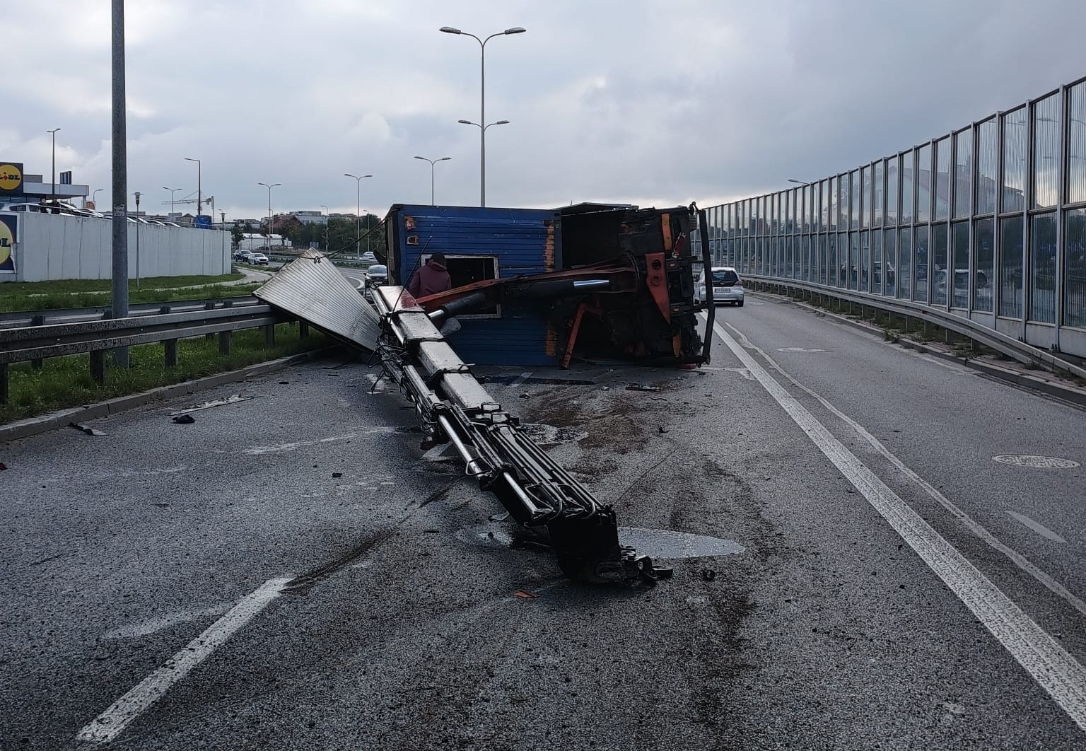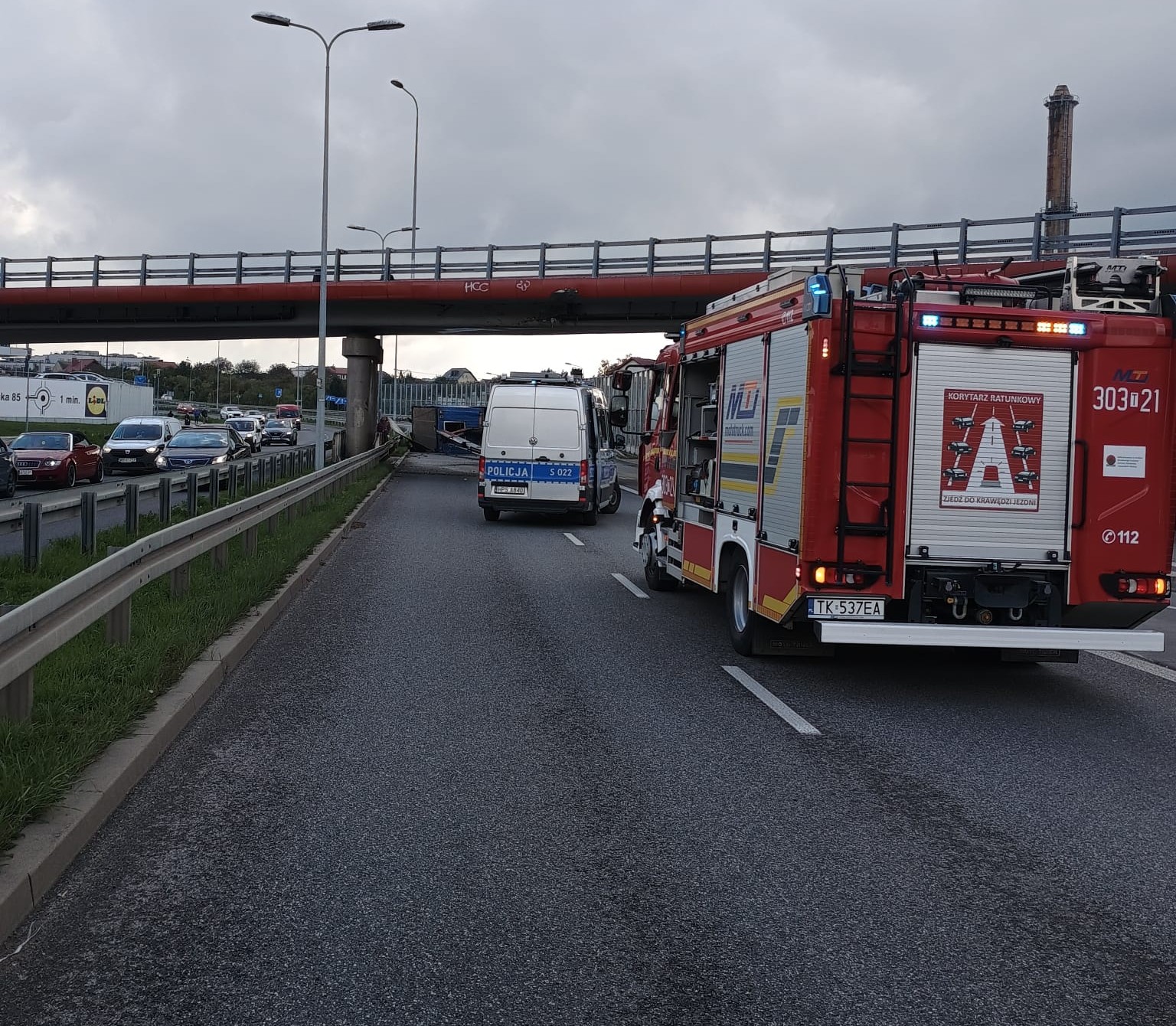 Ciężarówka marki MAN, transportująca kontener budowlany, przewróciła się na lewy bok, blokując dwa pasy ulicy Grunwaldzkiej w Kielcach w kierunku centrum. W działaniach ratowniczych uczestniczyły 3 zastępy Państwowej Straży Pożarnej, akcja trwała ponad sześć godzin. Pojazdem podróżowało dwóch mężczyzn, którzy opuścili kabinę o własnych siłach i, po przebadaniu przez Zespół Ratownictwa Medycznego pozostali na miejscu. W wyniku zdarzenia doszło do rozległych uszkodzeń infrastruktury drogowej, a na jezdnię wyciekł również olej hydrauliczny z żurawia. Strażacy zabezpieczyli miejsce zdarzenia, odłączyli zasilanie w pojeździe oraz ograniczyli ruch drogowy. Początkowo przejazd możliwy był jedynie buspasem, a w dalszej fazie droga została całkowicie zablokowana. Do postawienia ciężarówki na koła zadysponowano ciężki samochód ratownictwa technicznego z Jednostki Ratowniczo-Gaśniczej Numer 1 Kielce. Uszkodzona ciężarówka została odholowana na pobliski parking, a wycieki usunięte sorbentem.
