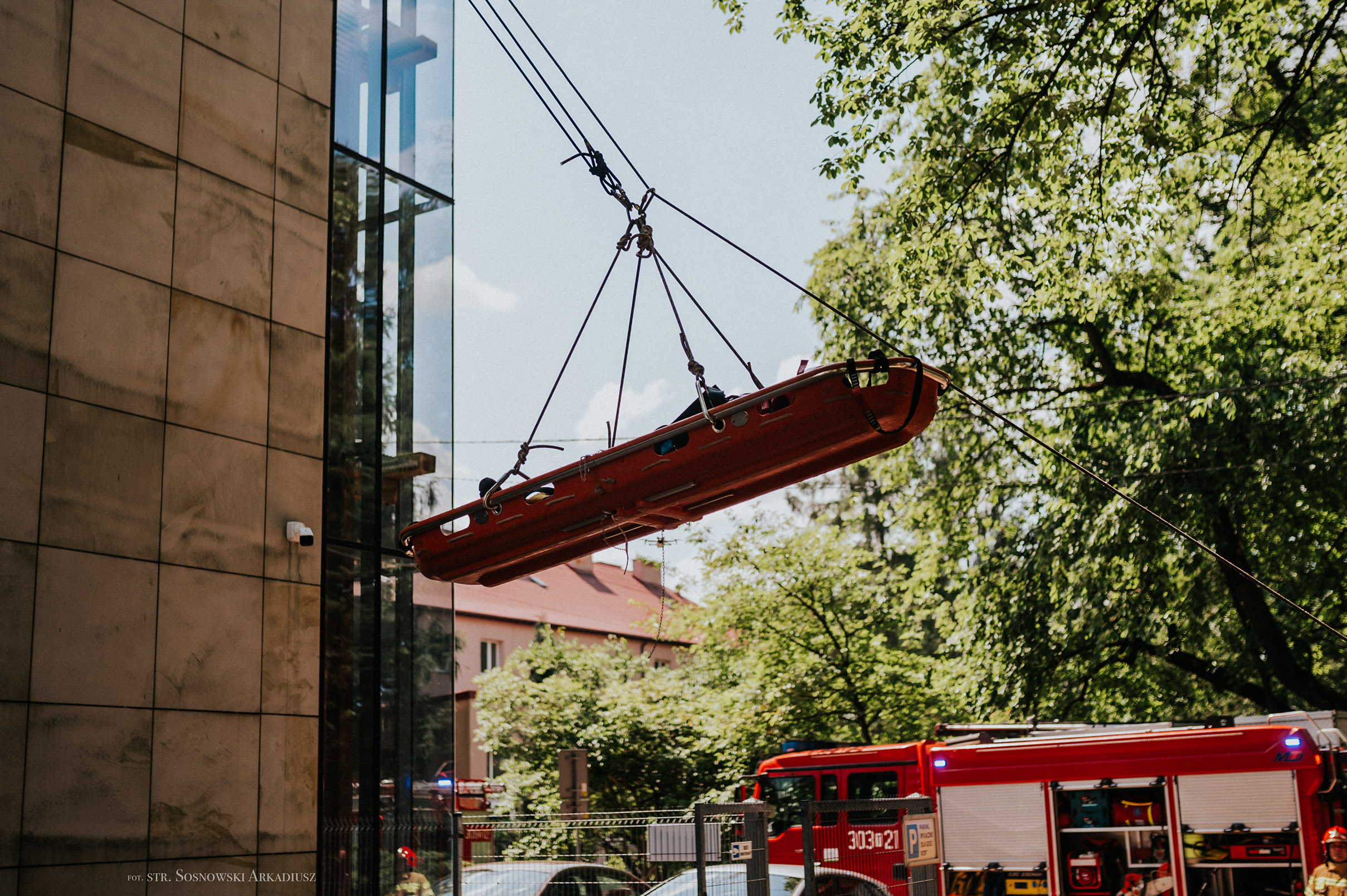 26 czerwca 2023r. kieleccy ratownicy sprawdzili procedury reagowania w dość nietypowych warunkach ćwiczebnych. Do laboratorium RCNT trafiła przesyłka, z której wysypał się proszek nieznanego składu, a dla pracowników laboratorium był to sygnał do ewakuacji budynku. Na pomoc laborantom ruszyli ratownicy ze Specjalistycznej Grupy Ratownictwa Chemiczno Ekologicznego z Kielc i Skarżyska Kam. Przed dotarciem ratowników dyrekcja RCNT ewakuowała pracowników, ale stres wśród pracowników wywołany sytuacją przyczynił się do powstania pożaru w pokoju socjalnym. Poszkodowaną pracownicę ewakuowali strażacy, którzy z wykorzystaniem technik alpinistycznych ewakuowali także pracownika technicznego, który utknął na dachu budynku. Zadania do realizacji czekały także przed kieleckimi policjantami – w czasie ewakuacji ujawniono podejrzany plecak pozostawiony przy bocznym wejściu do budynku. Szubka analiza materiału z kamer monitoringu wskazała potencjalnego sprawcę, który uciekając pojazdem zderzył się z przejeżdżającą trasą dojazdową do RCNT kolumną samochodów Wojsk Obrony Terytorialnej. Funkcjonariusze Policji zneutralizowali niebezpieczną przesyłkę i kontynuowali pościg za podejrzanym. Zderzenie z samochodami WOT wymusiło udział kolejnych sił ratowniczych, a mnogość poszkodowanych zaangażowała dwa plutony kieleckiej kompanii odwodowej, ratowników ŚCRMiTS oraz Kielecka Policja.