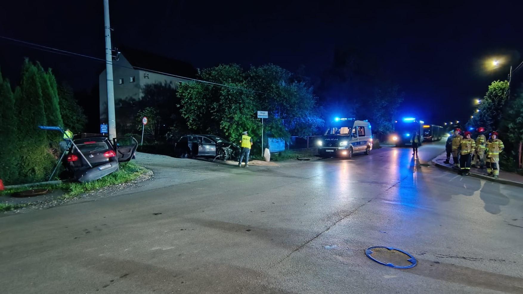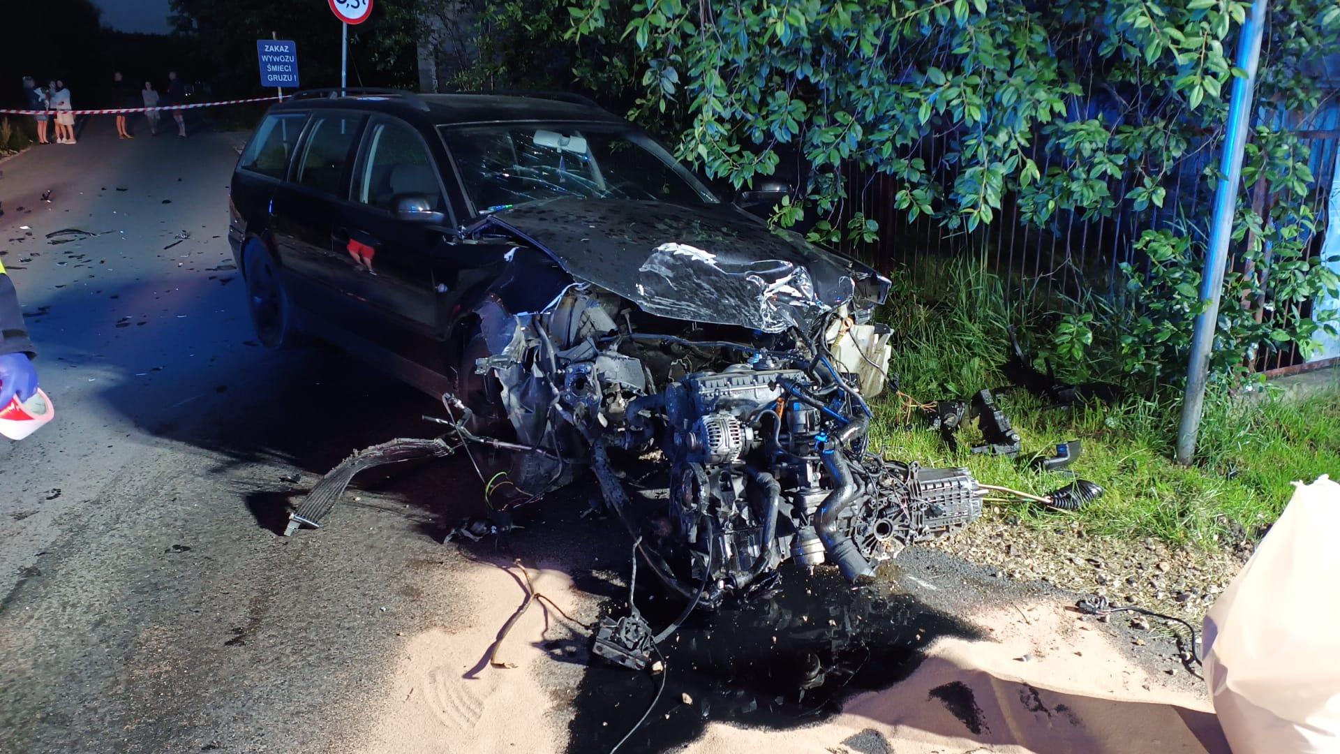 Volkswagen Passat i Volkswagen Golf zderzyły się na drodze gminnej, w wyniku czego drugie z aut uderzyło w ogrodzenie posesji. Podróżowało łącznie 5 osób i wszystkie samodzielnie opuściły pojazdy. Do zdarzenia przyjechały 4 zastępy straży pożarnej: ratownicy zabezpieczyli i oświetlili miejsce działań, udzielili kwalifikowanej pierwszej pomocy poszkodowanym oraz odłączyli zasilanie z akumulatorów w obu uszkodzonych autach. Po przybyciu Zespołu Ratownictwa Medycznego uczestników zdarzenia przebadano i 4 osoby zostały zabrane do szpitala. Na zakończenie, strażacy usunęli powstałe na jezdni plamy płynów eksploatacyjnych i uprzątnęli pozostałości udrażniając zamkniętą dla ruchu drogę.