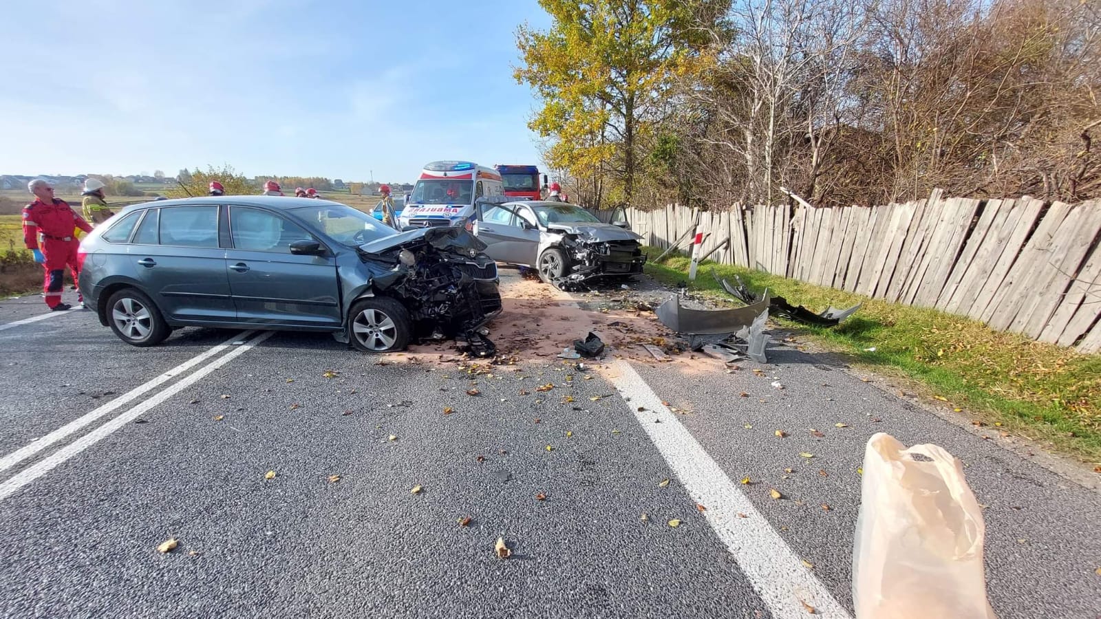 5 zastępów straży pożarnej w sile 21 ratowników usuwało skutki zderzenia pojazdów przez ponad 4 godziny.