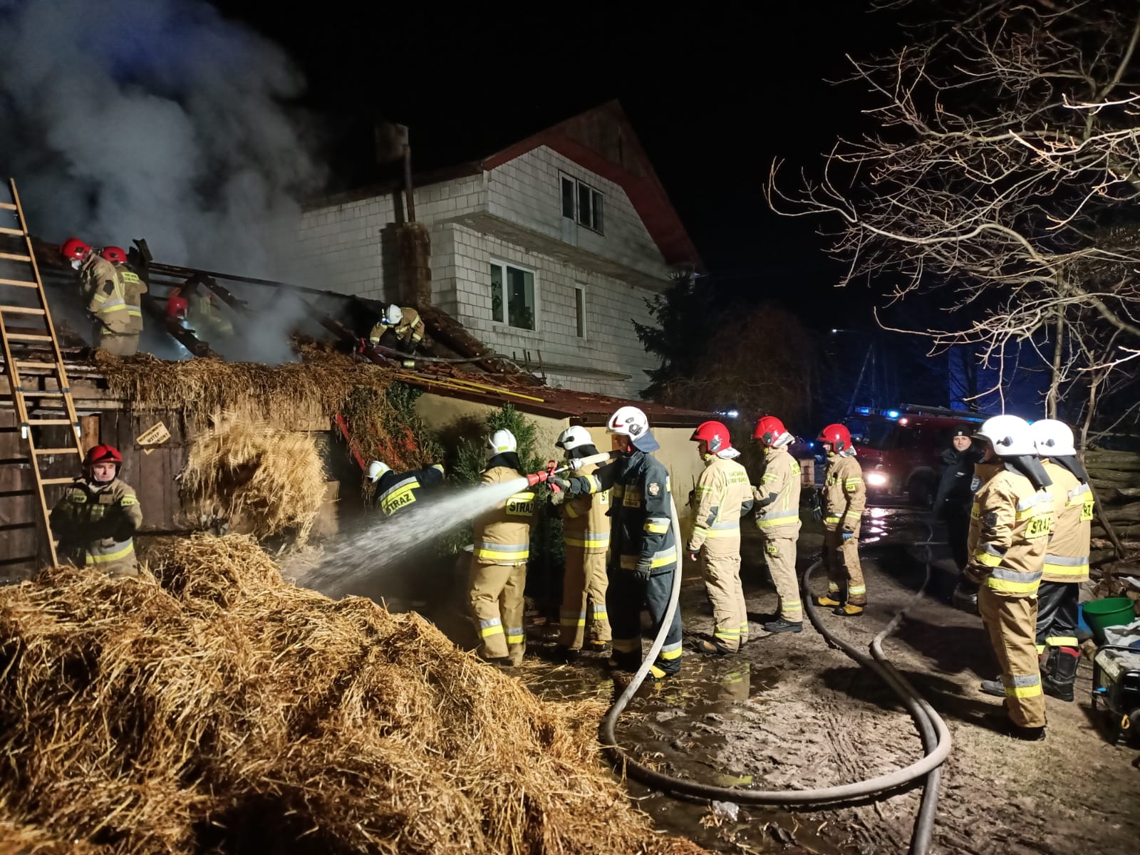 Do pożaru doszło na poddaszu budynku gospodarczego, w którym hodowano krowy i położonego w bezpośrednim sąsiedztwie domu mieszkalnego. Na ratunek zadysponowano 7 zastępów straży pożarnej w sile 29 ratowników, którzy zabezpieczyli miejsce zdarzenia, zdemontowali fragment dachu i przez powstałe dojście podali wodę na palącą się słomę. Po dojeździe kolejnych zastępów, ratownicy zwiększyli ilość podawanej wody i przystąpili do wyrzucania na zewnątrz materiału palnego w celu dokładnego dogaszenia. Po sprawdzeniu detektorem pomieszczenia, gdzie przebywały się zwierzęta hodowlane i wykluczeniu obecności niebezpiecznych gazów pożarowych odstąpiono od ewakuacji krów; pożar im nie zagrażał, a na zewnątrz panowała ujemna temperatura. Podczas działań strażacy stale monitorowali kamerą termowizyjną temperaturę w oborze, która od pożaru oddzielona była żelbetowym stropem. Po ugaszeniu palącej się słomy, pogorzelisko zostało dokładnie sprawdzone pod kątem ewentualnych zarzewi ognia oraz atmosfera poddasza skontrolowana detektorem – urządzenia nie wykryły żadnych zagrożeń. W wyniku tego pożaru nikt nie został poszkodowany ani nie ucierpiało żadne zwierzę.