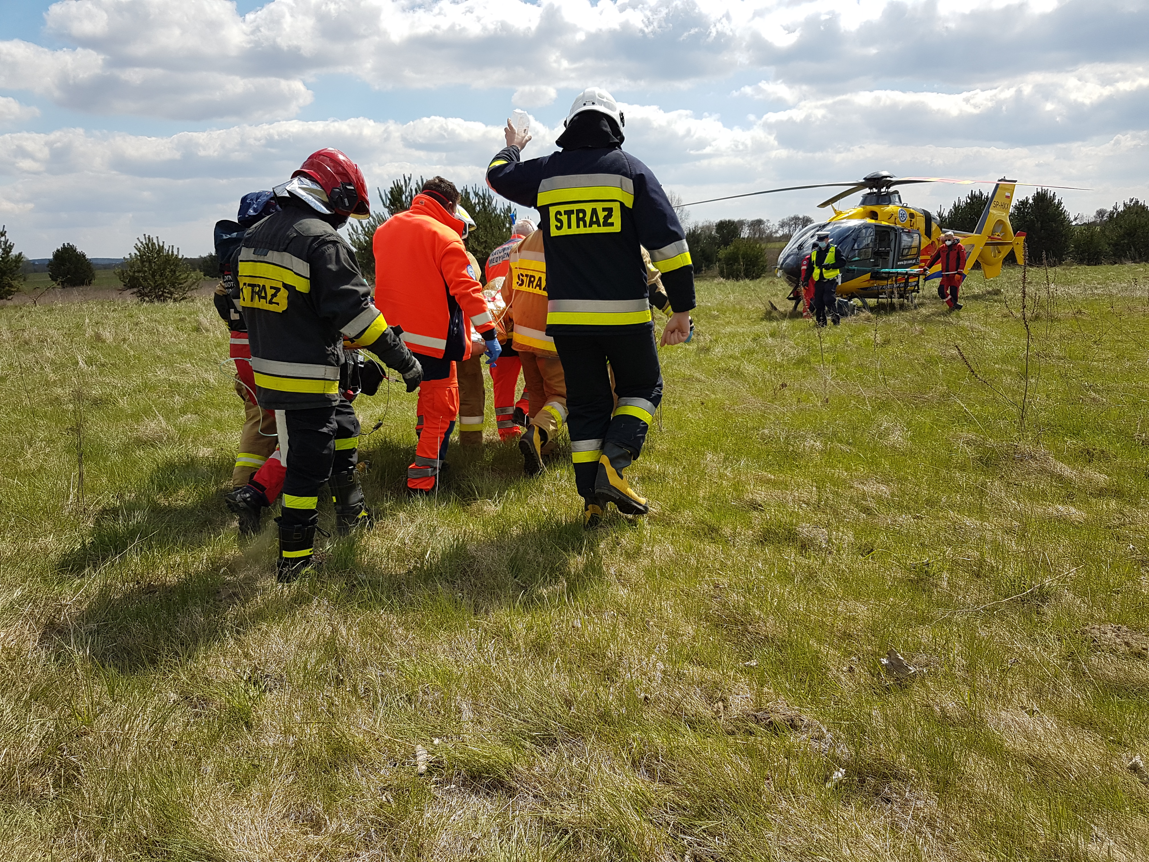 Do zdarzenia zadysponowano dwa zastępy z JRG nr 4 w Chmielniku oraz dwa zastępy z najbliższych jednostek OSP. Na miejscu okazało się, że doszło do dachowania samochodu osobowego, który w chwili naszego przybycia znajdował się w przydrożnym rowie. Kierowca samochodu, wypadł z pojazdu podczas dachowania i znajdował się pod opieką ratowników z Lotniczego Pogotowia Ratunkowego oraz zespołu ratownictwa medycznego Państwowego Ratownictwa Medycznego. Działania zastępów straży pożarnej polegały na zabezpieczeniu miejsca zdarzenia, zakręceniu instalacji gazowej w pojeździe, oraz wspólnie z ratownikami medycznymi udzieleniu pomocy poszkodowanemu. Po przeprowadzeniu badań, poszkodowanego przetransportowano na noszach do śmigłowca LPR, którym został zabrany do szpitala. Ponadto strażacy zabezpieczyli lądowanie i start śmigłowca, uprzątnęli pozostałości powypadkowe z jezdni i usunęli powstałą na drodze plamę płynów eksploatacyjnych.Podczas prowadzonych działań droga wojewódzkabyłazablokowana w obu kierunkach.