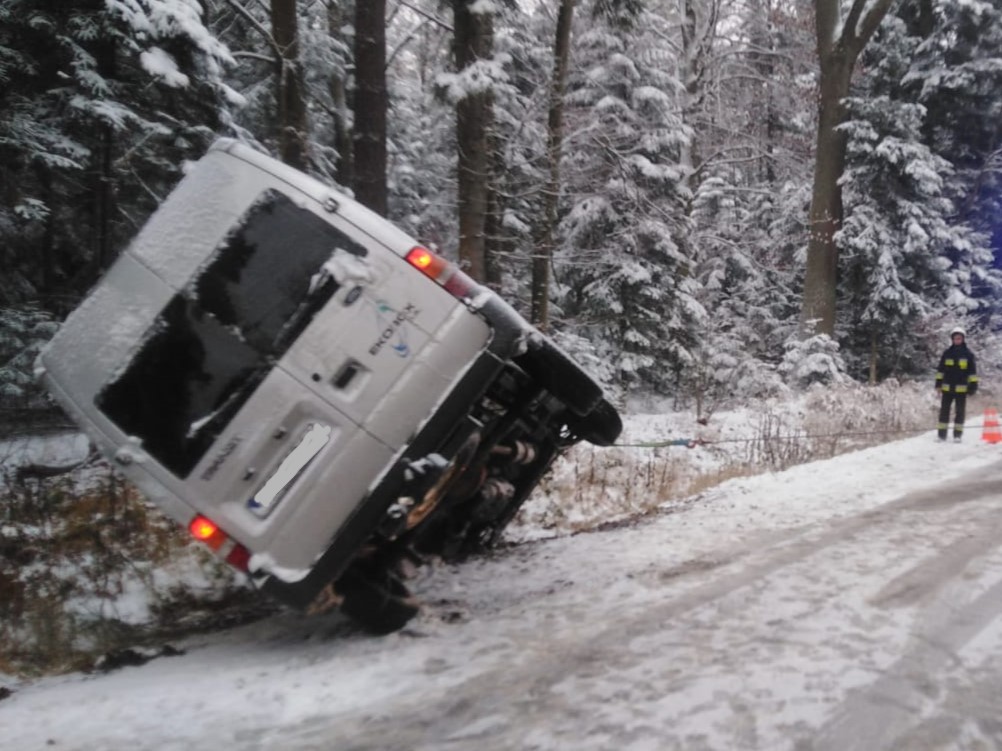 Bus do przewozu osób marki Ford Transit wiozący 7 osób wypadł z drogi i znajdował się w przydrożnym rowie. Wszyscy mężczyźni, obywatele Indii, bez problemu opuścili pojazd, a Zespół Ratownictwa Medycznego przebadał jednego z nich i podjął decyzję o zabraniu go do szpitala. Strażacy zabezpieczyli teren działań, odłączyli zasilanie z akumulatora w pojeździe oraz ustawili go bezpiecznie na kołach używając wyciągarki samochodowej.