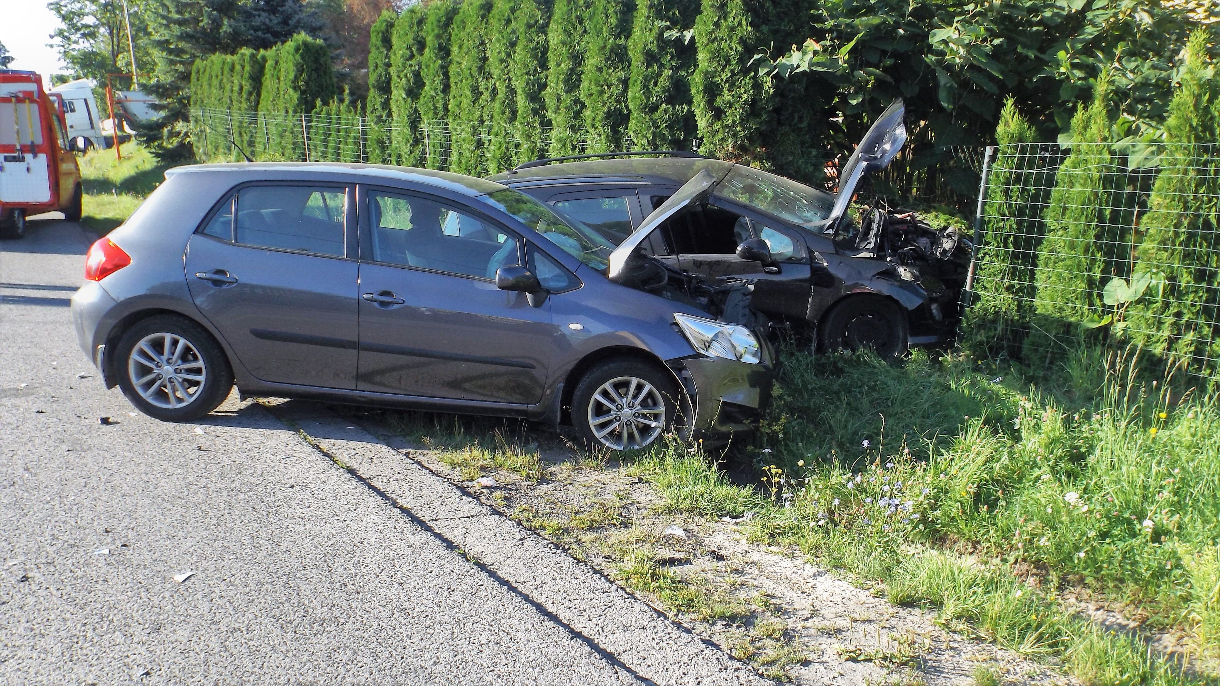 Samochody osobowe marki: Toyota Auris i Peugeot 308, którymi podróżowały łącznie 3 osoby uległy zderzeniu w wyniku czego oba auta znalazły się na poboczu uszkadzając jednocześnie ogrodzenie posesji. Wszystkie osoby biorące udział w zdarzeniu opuściły pojazdy o własnych siłach i tylko pasażerka Toyoty wymagała pomocy medycznej. Strażacy zapewnili bezpieczeństwo na terenie działań oraz udzielili kwalifikowanej pierwszej pomocy poszkodowanej kobiecie do czasu przybycia Zespołu Ratownictwa Medycznego. Po przebadaniu została ona zabrana do szpitala. Ratownicy odłączyli zasilanie z akumulatorów w obu pojazdach oraz sprawdzili je wykluczając ewentualne wycieki płynów eksploatacyjnych.