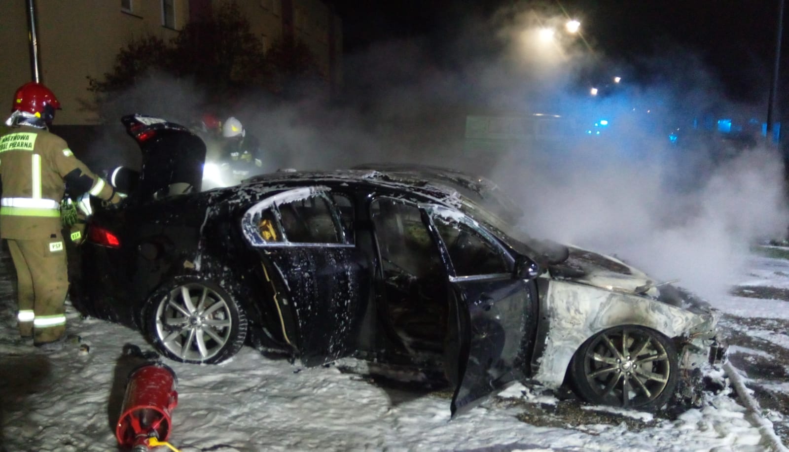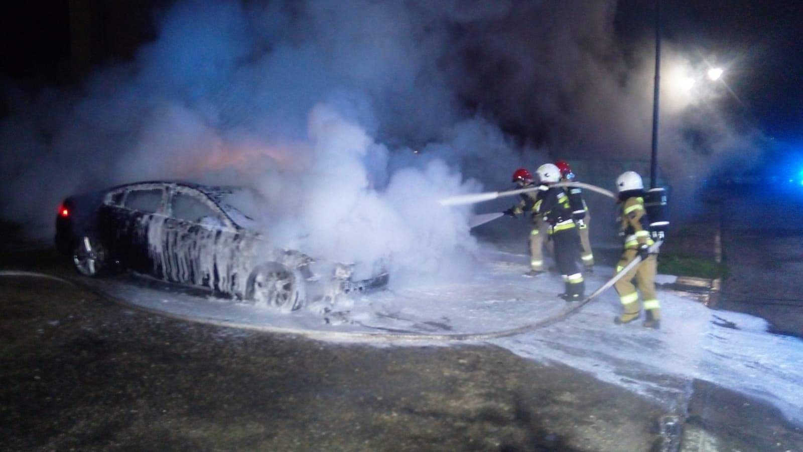 Na parkingu przy bloku mieszkalnym zapaliły się dwa zaparkowane obok siebie samochody osobowe: Seat oraz Jaguar. W chwili przybycia zastępów straży pożarnej auta całe były objęte ogniem. Strażacy zabezpieczyli teren działań i przystąpili do gaszenia pojazdów ciężką pianą gaśniczą. Wykorzystali także strumień wody oraz pianę średnią, którą wypełnili zniszczone auta. Po ugaszeniu ognia odłączono zasilanie z akumulatorów w samochodach i sprawdzono je przy użyciu kamery termicznej.