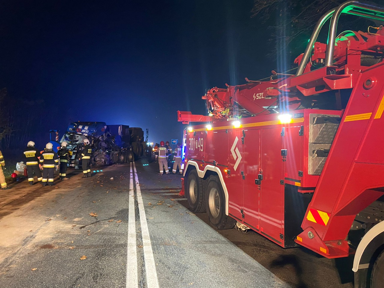 W wypadku na drodze krajowej numer 74 brały udział 3 pojazdy: ciężarówka Man z przyczepą, ciągnik siodłowy Scania R500 z naczepą niskopodwoziową wiozący maszynę budowlaną oraz samochód osobowy Nissan Almera, którymi podróżowali jedynie kierowcy. Przed przybyciem straży pożarnej na miejscu działał Zespół Ratownictwa Medycznego, który udzielał pomocy medycznej zakleszczonemu w pojeździe Scania mężczyźnie. Strażacy wykonali dostęp do poszkodowanego wykorzystując narzędzia hydrauliczne jednocześnie zabezpieczając teren działań oraz wdrożyli adekwatne procedury z pierwszej pomocy w stosunku do drugiego kierowcy. Dzięki sprawnej akcji ratowników mężczyzna i kobieta zostali szybko zaopatrzeni i przetransportowani do placówek medycznych. Równocześnie strażacy ograniczali sorbentem rozlew oleju napędowego z uszkodzonego zbiornika w ciężarówce Scania. Rozległe zniszczenia w tym pojeździe uniemożliwiły rozpięcie ciągnika i naczepy. W związku z tym na miejsce zdarzenia przybył specjalistyczny samochód ratownictwa technicznego Rotator i dzięki temu udało się rozłączyć zestaw tak aby zastępczy ciągnik mógł zabrać naczepę z ładunkiem w bezpieczne miejsce. Zniszczona ciężarówka została odholowana z miejsca zdarzenia i przywrócono ruch na krajowej 74.