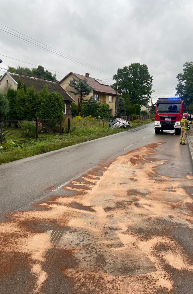 Na drodze powiatowej zderzył się samochód osobowy Peugeot 307 i motocykl ZIPP Toros, którymi podróżowali jedynie kierowcy. Tylko motocyklista wymagał pomocy medycznej, której udzielił mu przybyły na miejsce Zespół Ratownictwa Medycznego. Po przebadaniu i opatrzeniu mężczyzna został zabrany do szpitala. Strażacy zabezpieczyli i oznakowali teren działań oraz usunęli powstałą na jezdni plamę płynów eksploatacyjnych. Pojazdy znajdowały się poza drogą i dzięki temu ruch odbywał się z niewielkimi utrudnieniami.