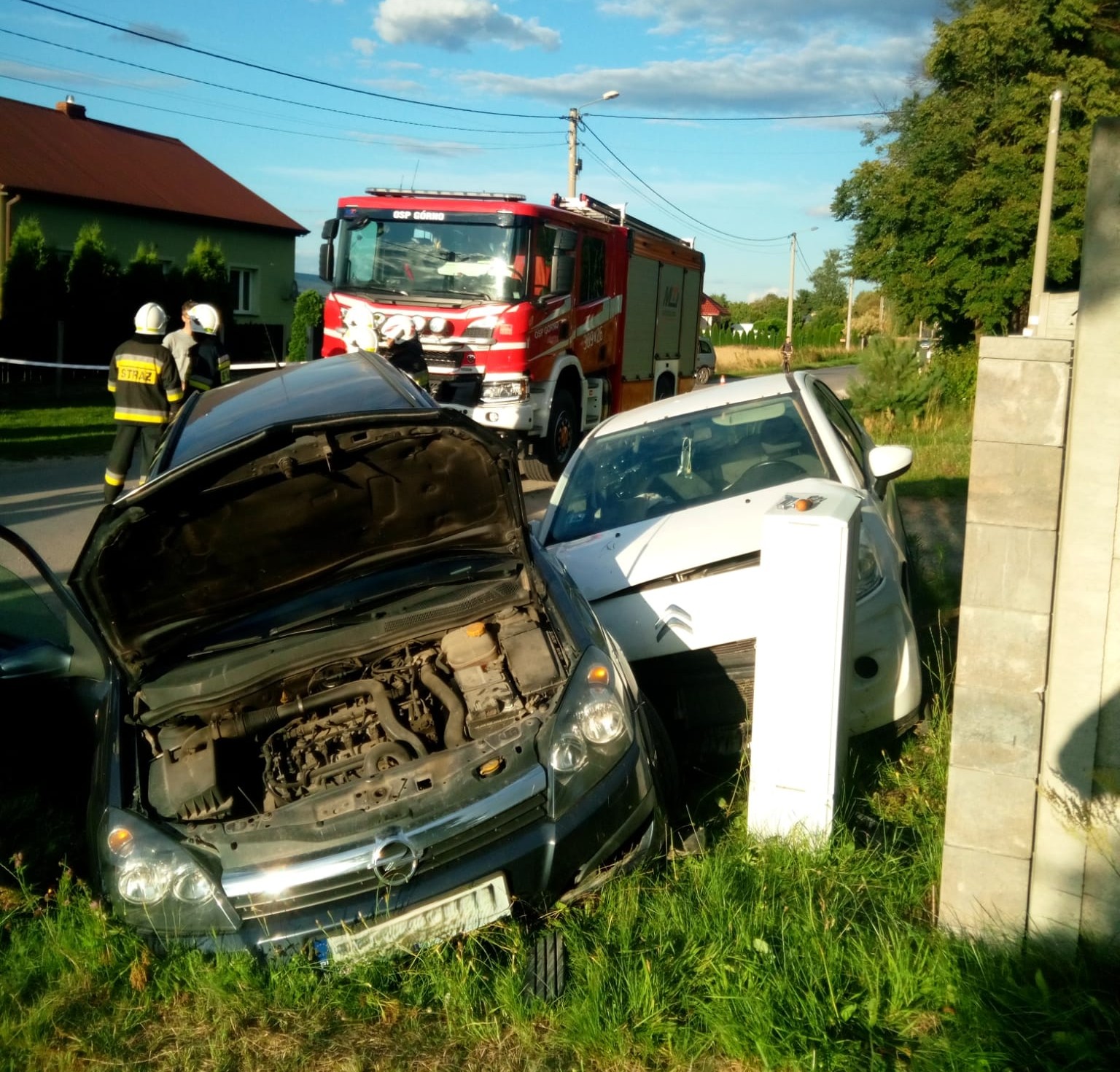 Na drodze gminnej zderzyły się 2 samochody osobowe: Opel Astry oraz Citroen C3. Auta, którymi łącznie podróżowało 6 osób wpadły do przydrożnego rowu melioracyjnego. Kierujący Oplem został uwięziony w aucie, a pozostałe osoby samodzielnie opuściły pojazdy. Na miejscu działały 4 zastępy ratowników: 3 z JRG Nr 1 Kielce oraz 1 z OSP Górno. Strażacy zabezpieczyli miejsce zdarzenia i wdrożyli procedury kwalifikowanej pierwszej pomocy wszystkim poszkodowanym. Równolegle przystąpiono do stabilizacji pojazdu, w którym znajdował się zakleszczony kierowca i, przy użyciu narzędzi hydraulicznych wykonali dostęp do niego. Ewakuowany na desce ortopedycznej mężczyzna został przekazany personelowi Lotniczego Pogotowia Ratunkowego. Kierowca i trzy pasażerki Opla zostali zabrani do szpitala. W trakcie działań odłączono także zasilanie z akumulatorów w pojazdach .