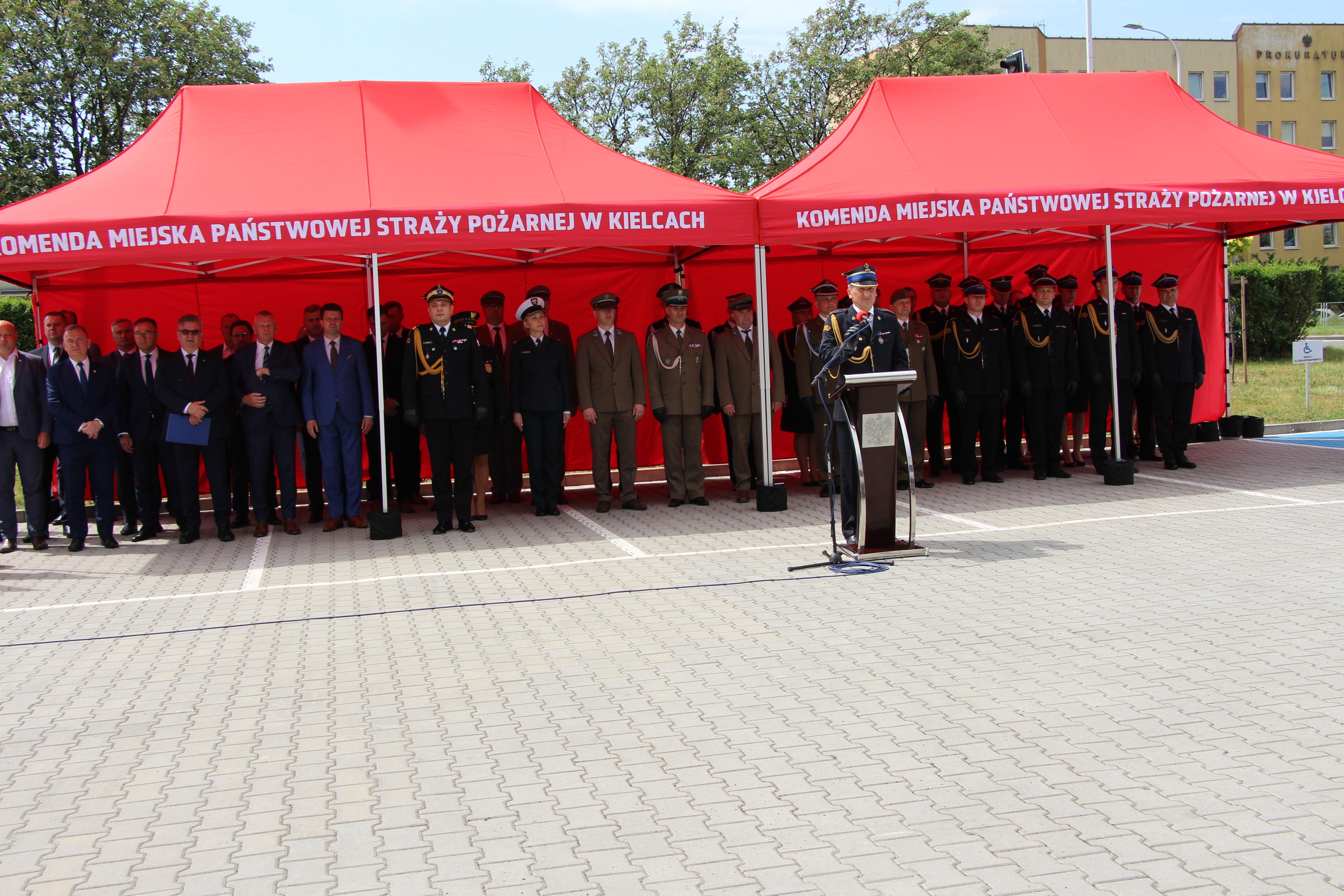 Rangę uroczystości podniosła obecność zaproszonych gości w tym między innymi: Świętokrzyskiego Komendanta Wojewódzkiego nadbryg. Krzysztofa Cioska, Dyrektora Generalnego ŚUW pana Ireneusza Piaseckiego, starosty powiatu kieleckiego pana Tomasza Plebana, sekretarza Miasta Kielce pana Szczepana Skorupskiego, prezesa Zarządu Oddziału Powiatowego ZOSP RP dh Ireneusza Żaka, przedstawicieli służb ratowniczych oraz formacji mundurowych, przedstawicieli związków zawodowych, burmistrzów i wójtów gmin powiatu oraz zaprzyjaźnionych firm i przedsiębiorstw. Uroczystość rozpoczął meldunek, który złożył dowódca uroczystości kpt. Piotr Sorbian Świętokrzyskiemu Komendantowi Wojewódzkiemu nadbryg. Krzysztofowi Cioskowi. Następnie przy dźwiękach hymnu na maszt wciągnięto flagę państwową. Gospodarz uroczystości bryg. Mariusz Góra przywitał przybyłych gości, a po przywitaniu nastąpiło wręczenie odznaczeń oraz aktów nadania wyższych stopni służbowych. Z okazji miejskich obchodów Dnia Strażaka odznaczenia otrzymali:
