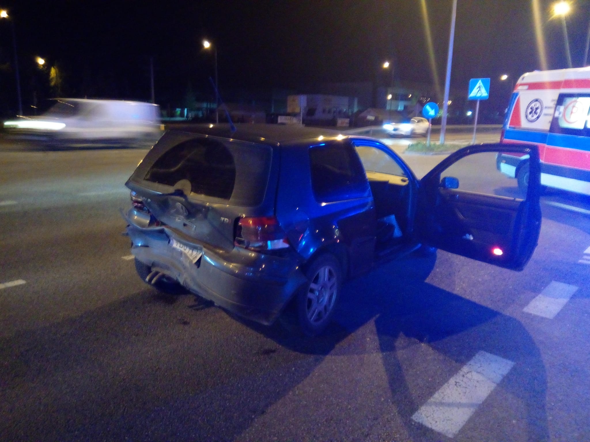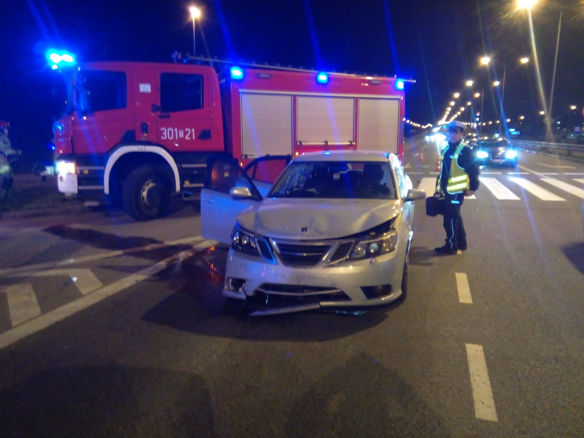 Dwa samochody osobowe marki: Volkswagen Golf oraz Saab 93, którymi podróżowały jedynie 2 kierujące zderzyły się, w wyniku tego został zablokowany jeden pas ruchu. Panie samodzielnie wysiadły z aut, ale osoba kierująca Volkswagenem wymagała pomocy lekarskiej. Strażacy zabezpieczyli teren działań, wdrożyli procedury kwalifikowanej pierwszej pomocy w stosunku do poszkodowanej oraz odłączyli zasilanie z akumulatorów. Zespół Ratownictwa Medycznego przebadał kobietę i zabrał ją do szpitala. Ratownicy usunęli plamy płynów eksploatacyjnych z jezdni, a uszkodzone pojazdy zepchnięto na pobocze udrażniając przejazd.