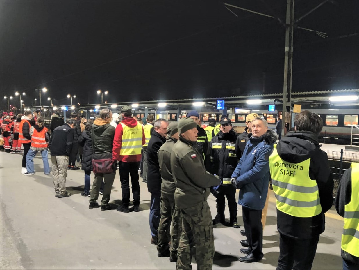 Państwowa Straż Pożarna, Ochotnicza Straż Pożarna, Policja, Straż Miejska, Ratownictwo Medyczne, Polski Czerwony Krzyż, Wojska Ochrony Terytorialnej oraz wolontariusze stawili się na dworcu kolejowym w Kielcach aby pomóc w transporcie osób narodowości Ukraińskiej w tym chorych dzieci podczas procesu relokacji. Z wagonu specjalnego pociągu przeprowadzano przybyłych podróżników oraz przeniesiono ich bagaże do podstawionego autokaru i busów, które odwoziły pasażerów do wyznaczonych miejsc zakwaterowania. Dodatkowo 3 karetki pogotowia ratunkowego transportowały wyznaczone osoby do kieleckich szpitali. Na dworcu był także wojewoda świętokrzyski Zbigniew Koniusz, świętokrzyski komendant wojewódzki Państwowej Straży Pożarnej st. bryg. Krzysztof Ciosek i komendant miejski PSP st. bryg. Sławomir Karwat. Cała akcja przebiegła szybko i sprawnie.