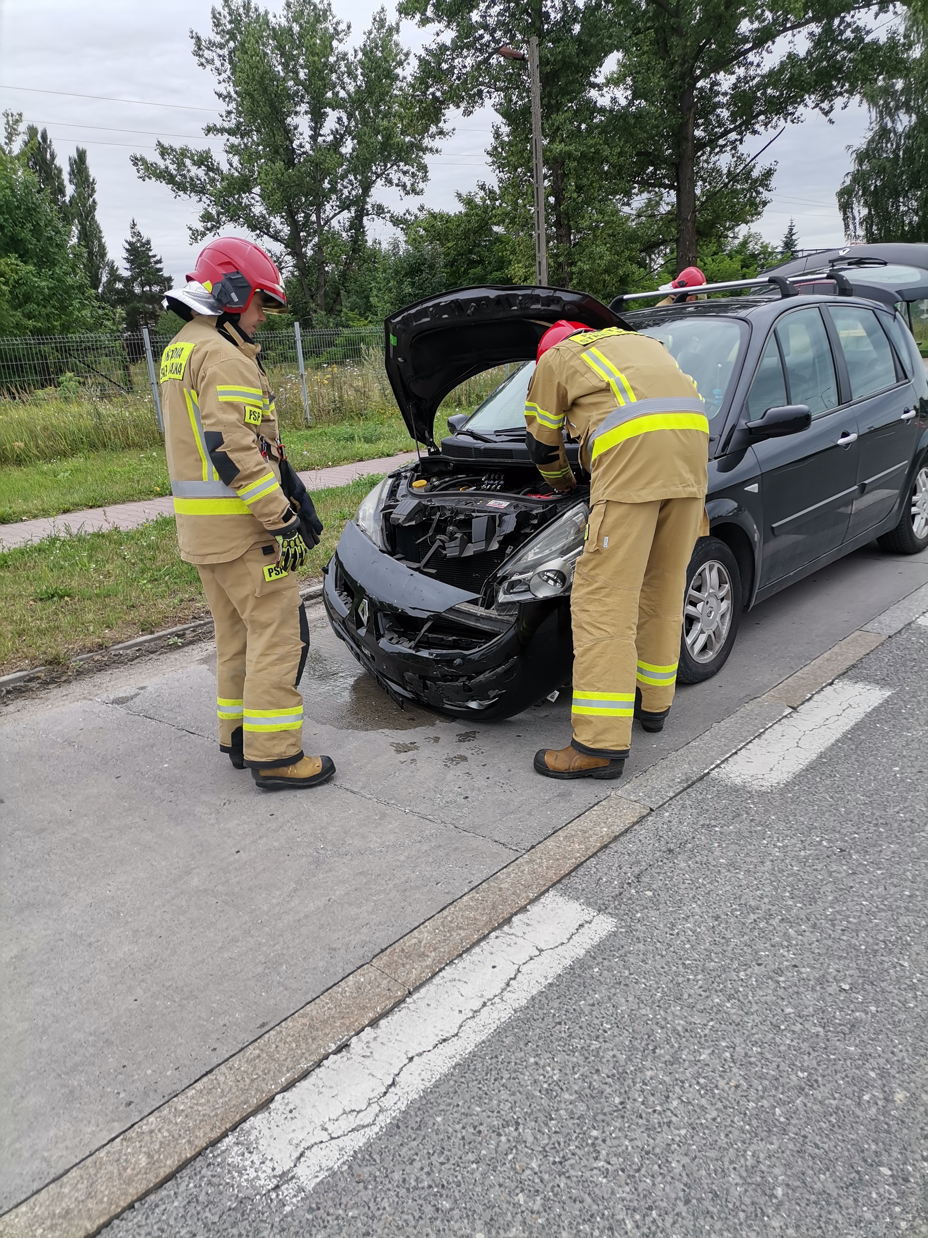 Dwa auta osobowe marki Renault Scenic i Audi A6, którymi podróżowali jedynie kierowcy, zderzyły się na drodze wojewódzkiej numer 762. Obaj mężczyźni samodzielnie opuścili pojazdy i nie wymagali pomocy medycznej, a samochody stały na poboczu nie utrudniając przejazdu. Na jezdni leżały tylko fragmenty obu pojazdów i powstał wyciek płynów eksploatacyjnych. Strażacy zabezpieczyli i znakowali teren działań, odłączyli zasilanie z akumulatora, zakręcili zawór na zbiorniku LPG tylko w jednym aut, usunęli plamę z jezdni i uprzątnęli drogę.