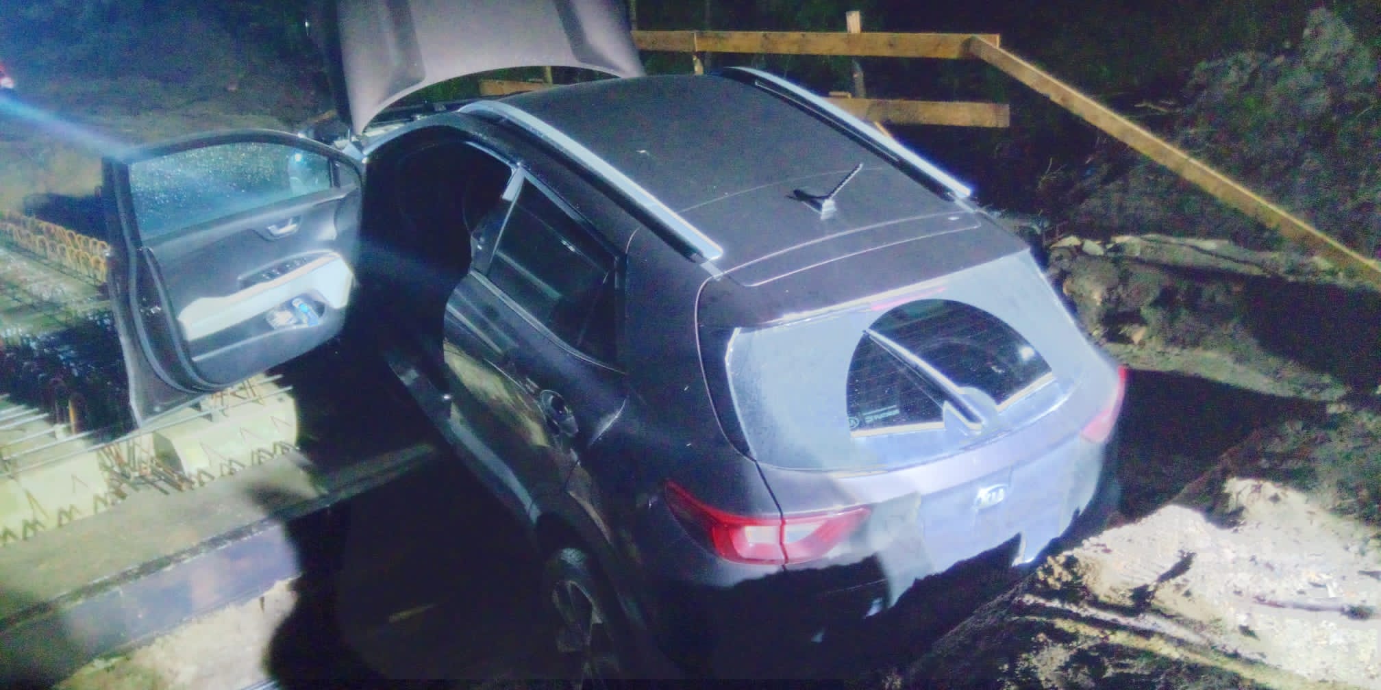 Samochód osobowy marki KIA Stonic, którym podróżowały dwie osoby, wjechał w nowo budowany przepust drogowy nad strumieniem. Obie osoby samodzielnie opuściły pojazd i czekały na przybycie służb. Strażacy zabezpieczyli i oznakowali teren działań oraz odłączyli zasilanie z akumulatora w pojeździe. Zespół Ratownictwa Medycznego przebadał poszkodowanych i pozostawił ich na miejscu zdarzenia. Na miejscu działało 5 zastępów straży pożarnej w sile 23 ratowników.