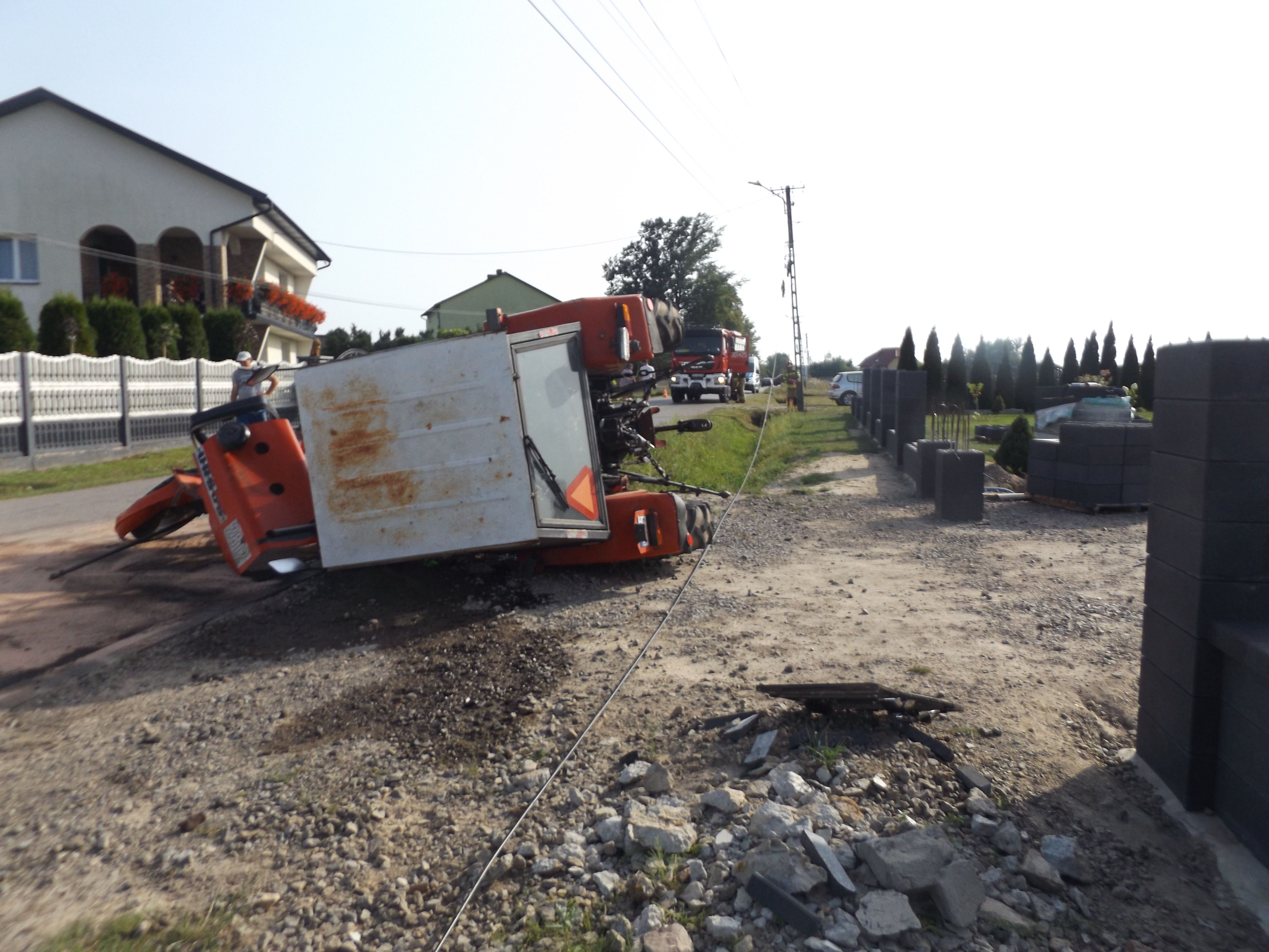 Samochód osobowy marki Volkswagen Passat zderzył się z ciągnikiem rolniczym marki Ursus. Pojazdami jechali sami kierowcy, którzy nie wymagali pomocy medycznej. Auto osobowe wpadło do przydrożnego rowu i uderzyło w słup energetyczny, a ciągnik leżał na wjeździe na posesję częściowo blokując pas jezdni na drodze gminnej. Strażacy zabezpieczyli i oznakowali teren działań, odłączyli zasilane z akumulatora w ciągniku i usunęli plamę płynów eksploatacyjnych z jezdni.