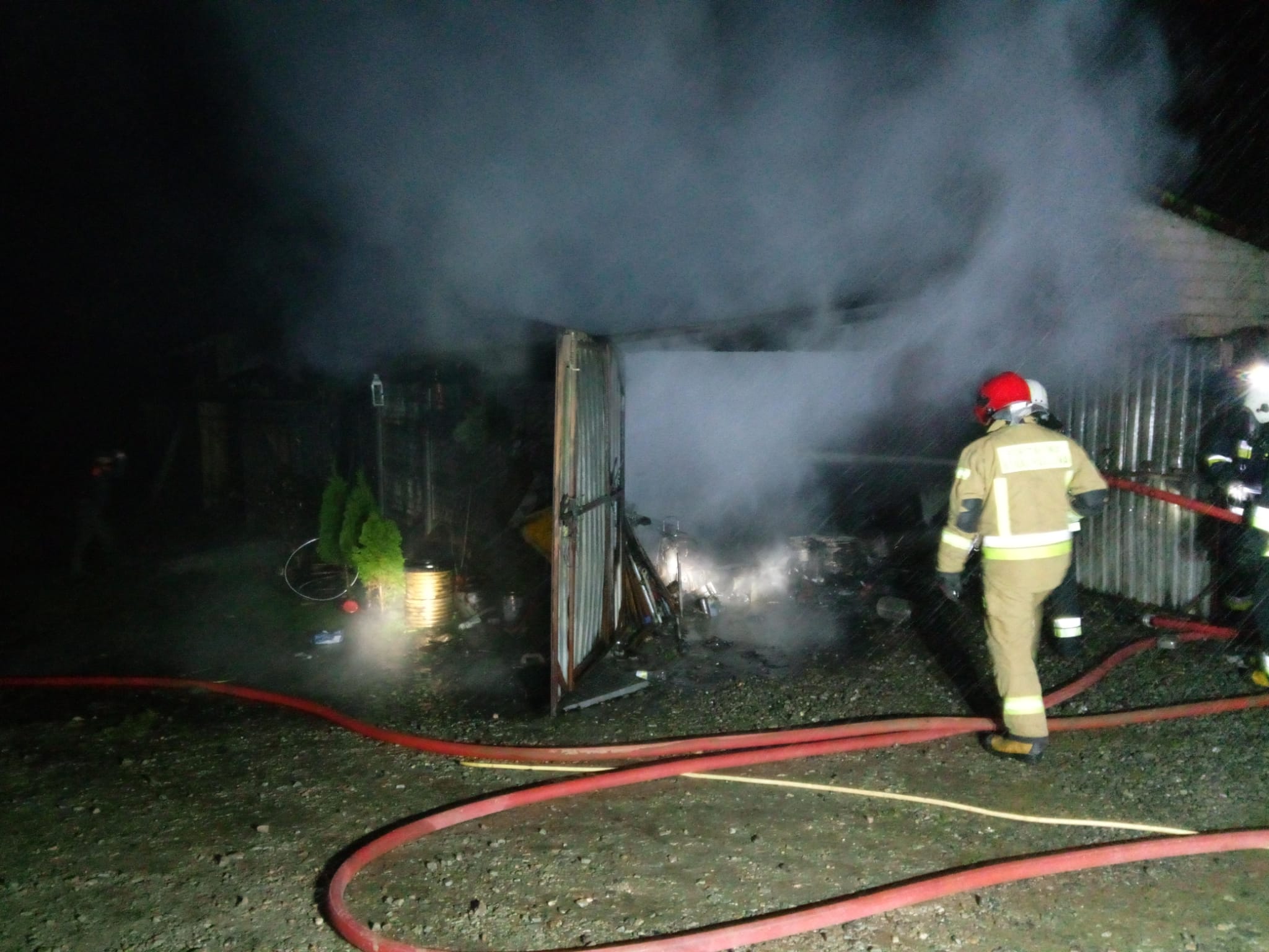 Pożar powstał w budynku inwentarskim położonym w kompleksie budynków gospodarczych znajdujących się zaledwie 8 metrów od domu jednorodzinnego. Właściciel, przed przybyciem zastępów straży pożarnej wyprowadził 2 konie na zewnątrz. Ratownicy zabezpieczyli teren działań, wyłączyli zasilanie elektryczne w zabudowaniach gospodarczych i rozpoczęli walkę z ogniem. Jednocześnie wdrożyli procedury z zakresu kwalifikowanej pierwszej pomocy w stosunku do właściciela posesji. Przybyły na miejsce Zespół Ratownictwa Medycznego przebadał mężczyznę i pozostawił go na miejscu zdarzenia. Gdy ogień został opanowany strażacy wynosili nadpalone elementy wyposażenia budynków na zewnątrz dogaszając je wodą oraz demontowali zniszczone przez ogień elementy konstrukcji. Na zakończenie miejsce pożaru sprawdzono kamerą termowizyjną, która potwierdziła brak zarzewi ognia. 6 zastępów strażaków działało przez ponad 2 godziny gasząc ten pożar.