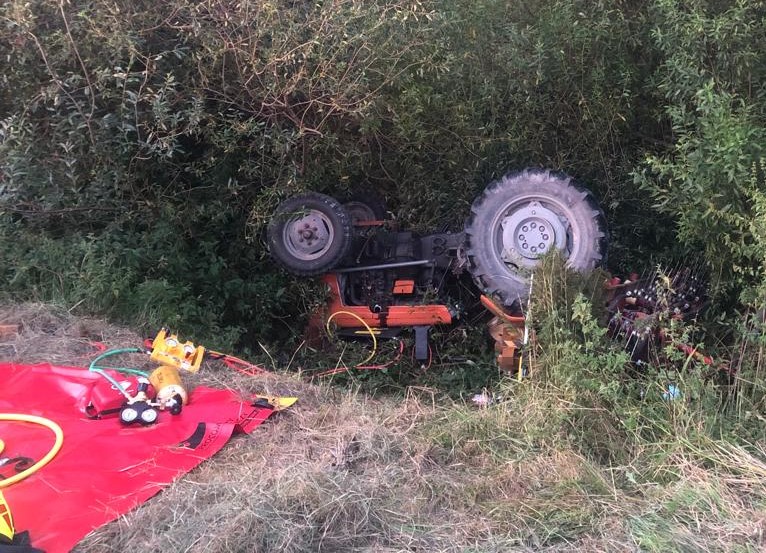 Podczas prac rolniczych ciągnik Ursus C330 z podwieszoną przetrząsarką taśmową do siana przewrócił się do góry kołami przygniatając kierującego nim mężczyznę. Maszyna zsunęła się do niewielkiego wąwozu co znacząco utrudniło dostęp do poszkodowanego. Strażacy zabezpieczyli teren działań i wykorzystując poduszki pneumatyczne oraz sprzęt hydrauliczny wydobyli mężczyznę spod pojazdu. Poszkodowany został przekazany Zespołowi Ratownictwa Medycznego, ale jego życia nie udało się uratować. Ratownicy rozstawili parawan osłaniający oraz oświetlili teren działań na czas prowadzenia czynności wyjaśniających okoliczności zdarzenia.