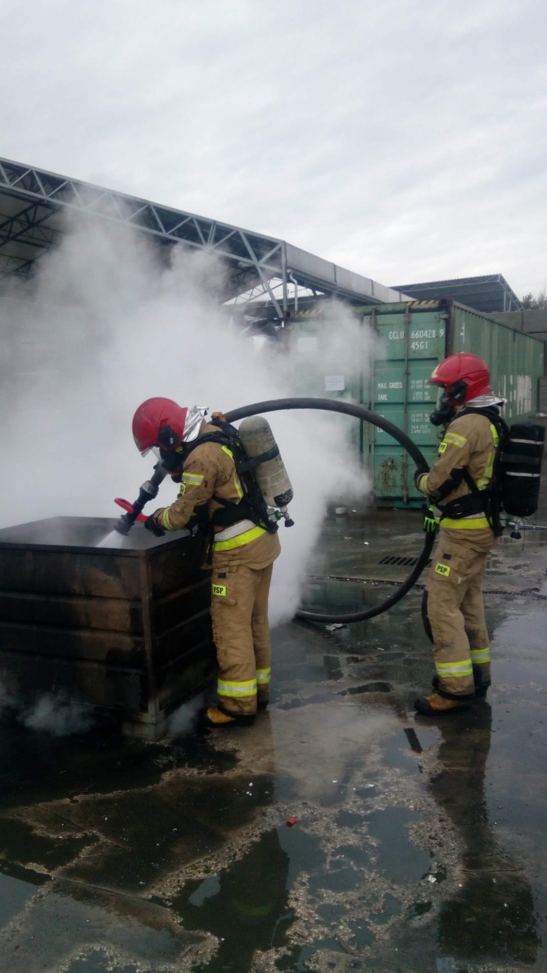 Z kontenera morskiego, w którym składowane były w metalowych, zamykanych pojemnikach baterie litowo jonowe, wydobywał się dym. Pracownicy firmy, przed przybyciem zastępów straży pożarnej rozpoczęli gaszenie pożaru wykorzystując gaśnice oraz jedną linię gaśniczą zasilaną motopompą z podziemnego zbiornika przeciwpożarowego. Akcję prowadziło 10 pracowników i nikt nie odniósł obrażeń. Strażacy zabezpieczyli teren działań i rozpoczęli walkę z pożarem w pierwszej fazie chłodząc powłokę kontenera oraz pryzmę urządzeń elektrycznych znajdującą się w pobliżu. Po otwarciu kontenera ratownicy ustalili, używając kamery termowizyjnej, w którym pojemniku wybuchł pożar i wyciągnęli do na zewnątrz. W bezpiecznym miejscu ugasili pożar i schładzali rozgrzane ogniwa litowo-jonowe. Jednocześnie wyjęto pozostałe pojemniki z bateriami w celu kontroli temperatury wewnątrz nich. Dalszy proces schładzania ugaszonych baterii kontynuowali pracownicy firmy.