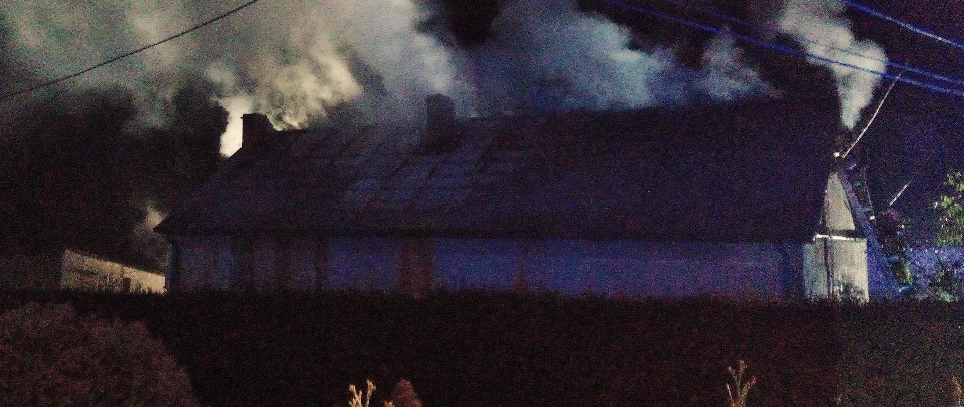 Ogień objął nieużytkowe poddasze, więźbę dachową oraz panele fotowoltaiczne zamontowane na blaszanym pokryciu. Osoba w nim zamieszkująca bezpiecznie opuściła dom odłączając zasilanie elektryczne zanim dojechały pierwsze zastępy straży pożarnej. Strażacy zabezpieczyli miejsce działań i w pierwszej kolejności ugasili płonące panele fotowoltaiczne. Ratownicy zabezpieczeni w aparaty ochrony dróg oddechowych wykorzystując okna w szczytach dachu dostali się na poddasze i ugasili pożar podając dwa strumienie wody. Zdemontowali fragment pokrycia dachowego w celu oddymienia pomieszczenia. Sprawdzili i dogasili nadpaloną więźbę dachową oraz przedmioty zgromadzone na strychu. Na koniec strażacy sprawdzili poddasze kamerą termowizyjną i detektorem wielogazowym wykluczając zagrożenia. Akcja ratowniczo-gaśnicza realizowana przez 6 zastępów straży pożarnej w sile 27 ratowników trwała ponad 3 godziny.