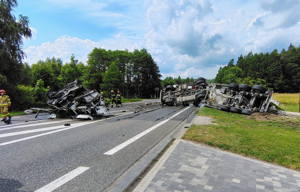 4 zastępy straży pożarnej ruszyły drogą krajową numer 74 do zdarzenia, gdzie samochód ciężarowy Renault z naczepą (typu silos) przewożący 27 ton piasku kwarcowego wypadł z jezdni uderzył w przydroży słup oświetleniowy i przewrócił się na bok. Część ciągnika i ładunek znajdował się w przydrożnym rowie wystając częściowo na jezdnię, a fragment z kabiną oderwał się od całości i leżał na jezdni. Powstała też śliska plama płynów eksploatacyjnych. Ruch drogowy został zablokowany. Autem podróżował tylko kierujący, który przy pomocy świadków zdarzenia opuścił pojazd. Strażacy zabezpieczyli i oznakowali miejsce zdarzenia, odłączeniu akumulatora w pojeździe usunęli plamę z jezdni. Jednocześnie udzielali poszkodowanemu kwalifikowanej pierwszej pomocy. Po przybyciu Zespołu Ratownictwa Medycznego mężczyzna został przebadany i zabrany do szpitala. Dalsze działania strażaków były związane z uszkodzeniem układu paliwowego w zniszczonej ciężarówce. Konieczne było przepompowanie paliwa ze zbiorników, aby nie dopuścić do wycieku oleju napędowego na jezdnię. Działania, a tym samym utrudnienia na drodze krajowej trwały ponad 3 godziny.