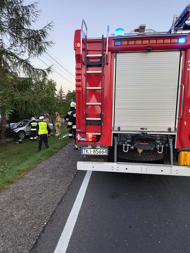 Pechowo dla 2 mężczyzn podróżujących samochodem osobowym marki Skoda Octavia rozpoczął się ten dzień. Jadąc drogą krajową numer 74 auto wypadło z drogi i uderzyło w ogrodzenie prywatnej posesji. Mężczyźni opuścili samodzielnie pojazd. Ratownicy, po zabezpieczeniu miejsca zdarzenia udzielili kwalifikowanej pierwszej pomocy kierowcy samochodu a następnie przekazali go Zespołowi Ratownictwa Medycznego. Strażacy odłączyli zasilanie z akumulatora w pojeździe. Podczas zderzenia uszkodzony został również znak drogowy.