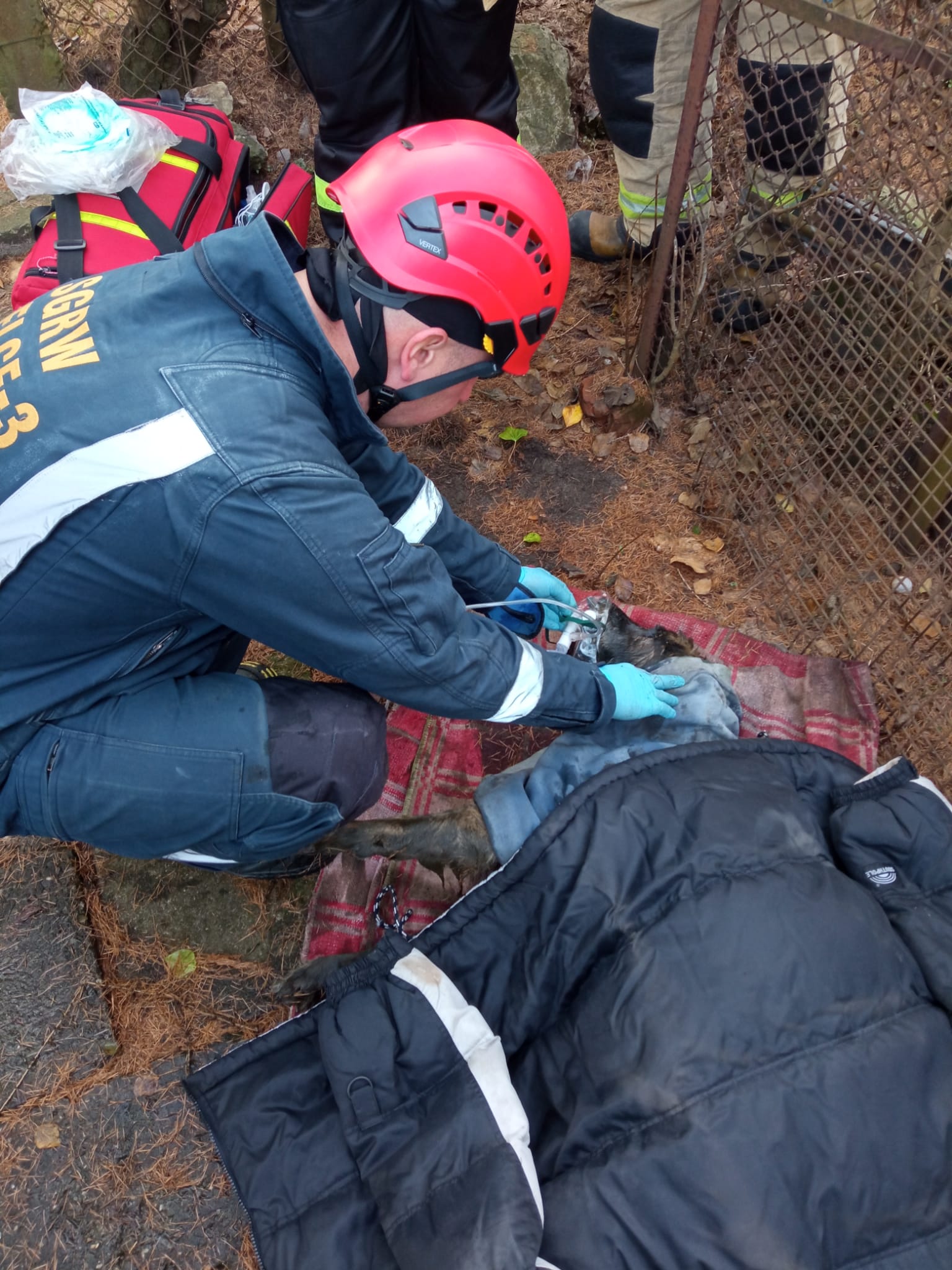 Do zbiornika na nieczystości, podczas kontroli poziomu napełnienia szamba wpadł pies i znajdował się żywy na głębokości około 2m. Strażacy ze Specjalistycznej Grupy Ratownictwa Wysokościowego „Kielce 3” zabezpieczyli miejsce działań, a ratownik zabezpieczony w aparat ochrony dróg oddechowych oraz specjalną uprząż i asekurowany liną ratowniczą zszedł po metalowej drabinie do zwierzęcia. Następnie ratownicy wyciągnęli psa na powierzchnię, opłukali mu czystą wodą drogi oddechowe i podali tlen jednocześnie zabezpieczyli go przed wyziębieniem. Właz rewizyjny do zbiornika zamknięto i zabezpieczono, a zwierzę po odzyskaniu sił zostało zabrane przez właściciela do domu.