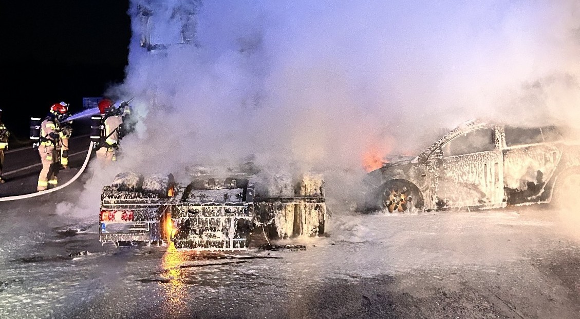 Zgłoszenie, które w nocy z 12 na 13 kwietnia 2025 roku około godziny 2:40 wpłynęło do kieleckich strażaków dotyczyło pożaru samochodu osobowego Opel Insignia i ciągnika siodłowego Mercedes Actros.