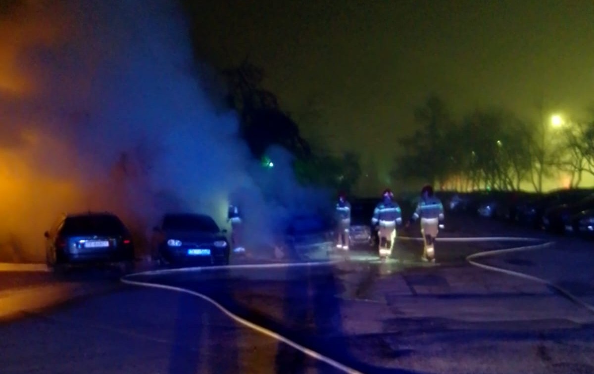 Na miejsce skierowano 2 zastępy Państwowej Straży Pożarnej. Po dojeździe na miejsce zdarzenia strażacy zastali w pełni rozwinięty pożar dwóch pojazdów – Audi oraz Volkswagena Golfa. Ogień obejmował całe samochody, a dodatkowo istniało zagrożenie dla zaparkowanych w pobliżu dwóch pojazdów. Na szczęście w wyniku zdarzenia nikt nie odniósł obrażeń. Ratownicy zabezpieczyli miejsce i ugasili ogień podając pianę ciężką na palące się auta i jednocześnie strumieniem wody chronili sąsiednie pojazdy. Po skutecznym ugaszeniu pożaru odłączono akumulator w Volkswagenie. Na zakończenie wszystkie pojazdy skontrolowano kamerą termowizyjną, nie stwierdzając dalszego zagrożenia.