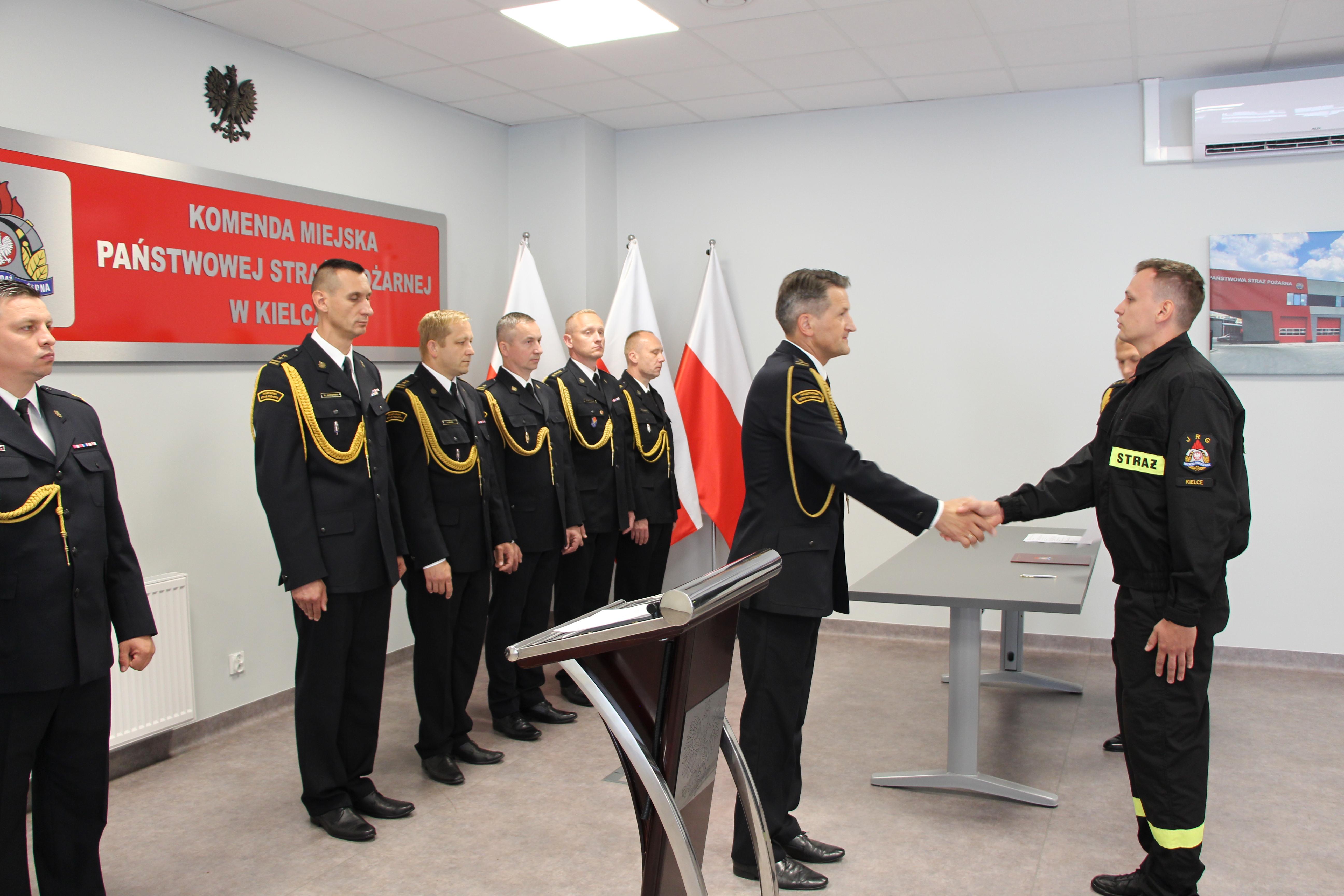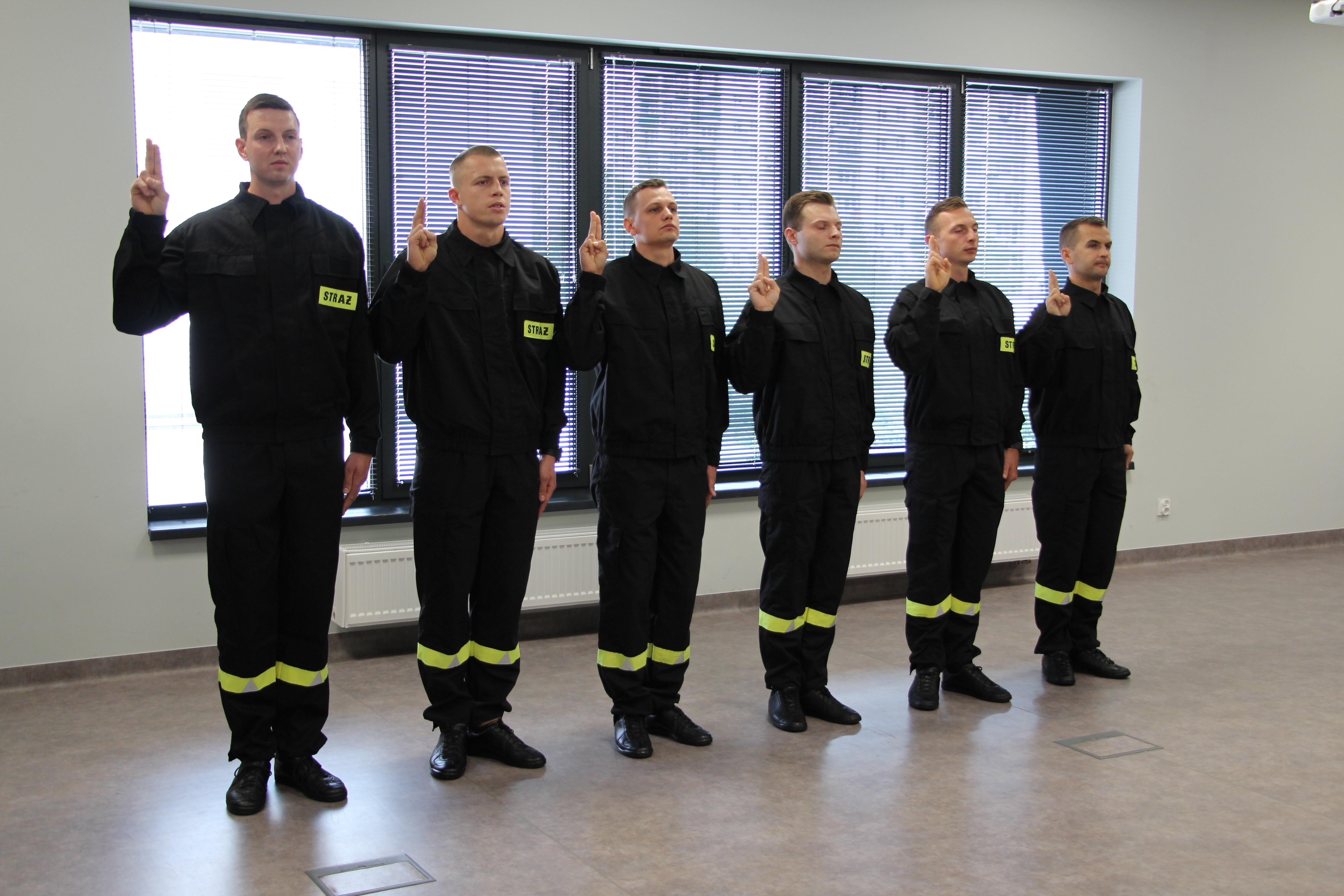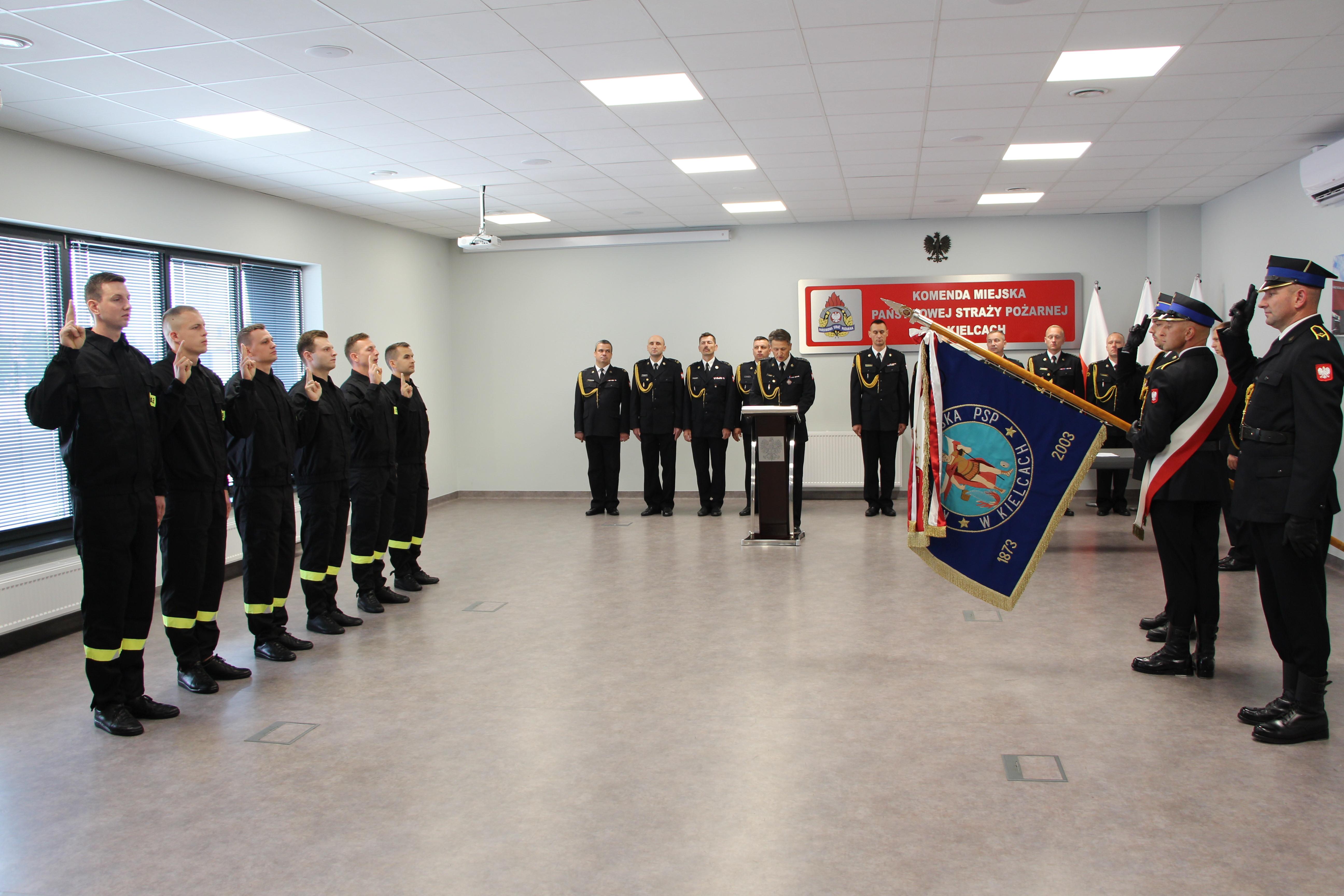 Świadkami tego podniosłego dla każdego strażaka wydarzenia byli: Komendant Miejski Państwowej Straży Pożarnej w Kielcach bryg. Mariusz Góra oraz jego zastępcy: bryg. Michał Jankowski i bryg. Piotr Sokól, dowódcy jednostek ratowniczo-gaśniczych i naczelnicy wydziałów tutejszej komendy. 6 nowych funkcjonariuszy przed sztandarem Komendy Miejskiej Państwowej Straży Pożarnej w Kielcach złożyło najważniejszą przysięgę na ścieżce zawodowej, którą właśnie rozpoczynają. Wypowiedziane słowa roty potwierdzają przynależność strażaka do formacji cieszącej ogromnym zaufaniem społecznym. Zanim rozpoczną służbę w jednostkach ratowniczo-gaśniczych nowoprzyjęci funkcjonariusze muszą odbyć trzymiesięczne szkolenie podstawowe w zawodzie strażaka.