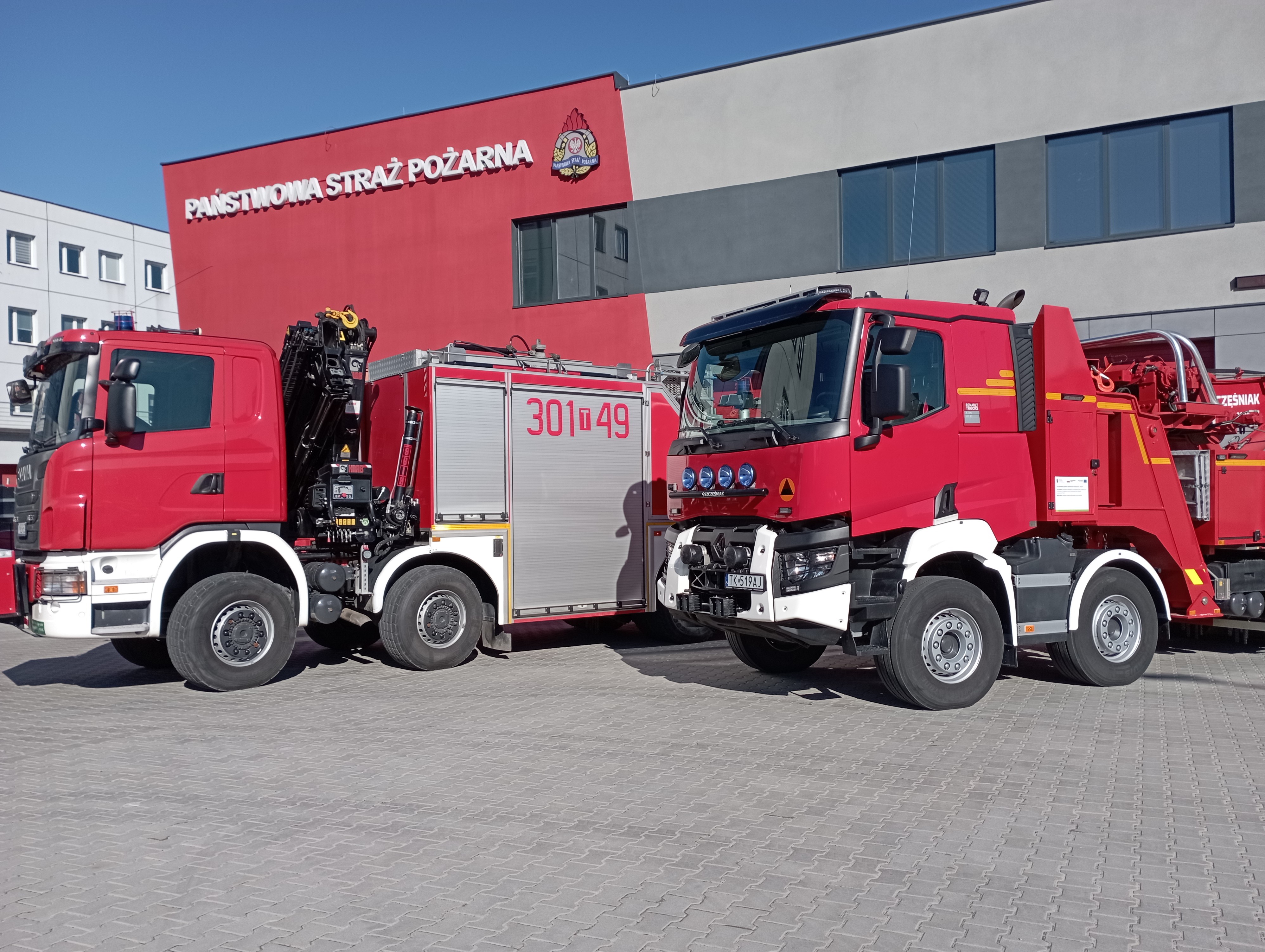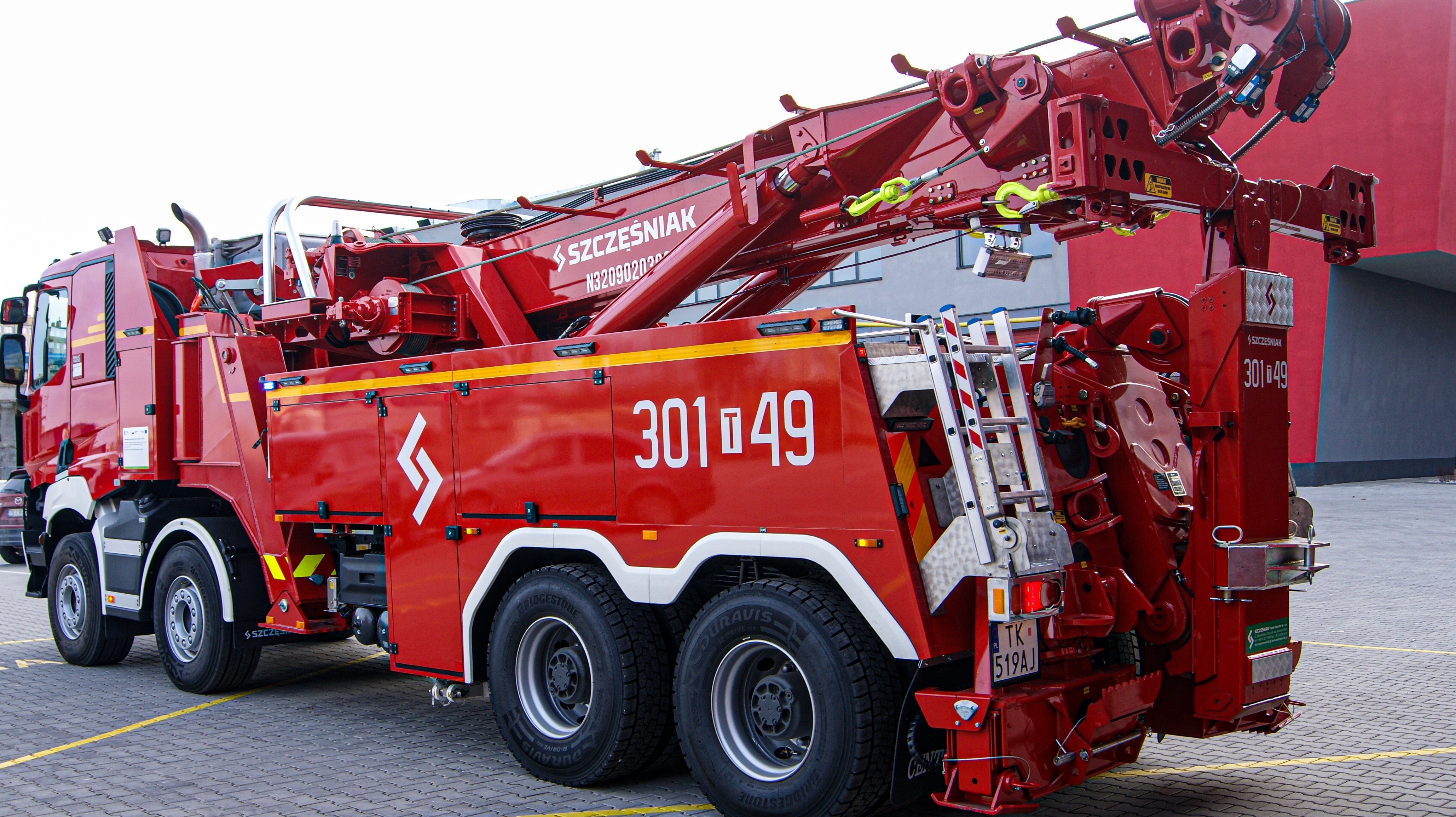 Ten olbrzym od dziś będzie pomagał w pracy kieleckim strażakom z Jednostki Ratowniczo- Gaśniczej Nr 1 w Kielcach. To samochód do zadań specjalnych i jego przeznaczeniem jest usuwanie zagrożeń występujących gównie w transporcie drogowym ze szczególnym uwzględnieniem pojazdów wielkogabarytowych. Pozwala mu na to zamontowany za kabiną, na ramie pomocniczej żuraw teleskopowy – rotator. Udźwig urządzenia jest imponujący, zaś cztery podpory zapewniają stabilność tego kolosa. Ramię holownicze zamontowane z tyłu pojazdu ma udźwig umożliwiający holowanie pojazdów ciężarowych. Siedem wyciągarek: dwie główne, dwie pomocnicze, dwie boczne i jedna na ramie pośredniej sprawia, że wóz jest bardzo wszechstronny. Możliwość sterowania wszystkimi wyciągarkami zdalnie to kolejna zaleta, którą nie sposób przecenić. Podstawą zabudowy jest podwozie Renault K520 P8X4 HEAVY.44 E6 z napędem 8×4 i silnikiem o mocy 520 KM z kabiną dwuosobową, a stalowo-aluminiowa konstrukcja nadwozia posiada dziewięć skrytek sprzętowych. Automatyczna skrzynia biegów oraz podwozie z blokadami mechanizmów różnicowych mostów napędowych oraz mechanizmem różnicowym międzyosiowym to kolejne atuty tego pojazdu.