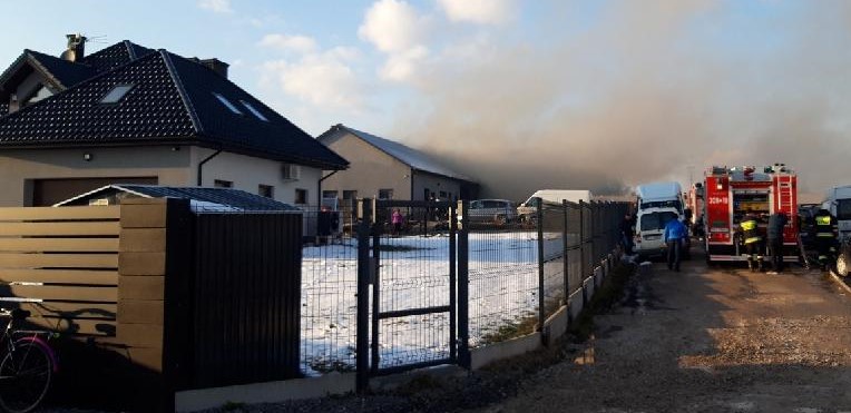 Ogień pojawił się w pomieszczeniu warsztatowo-garażowym i w chwili przybycia pierwszych zastępów straży pożarnej pożar rozgorzał w całej części garażowej niszcząc wyposażenie i dwa stojące w nim auta. Dym i ogień wydostały się na dach oraz przez ściany zewnętrzne w wyniku czego spalił się jeden samochód a dwa zostały uszkodzone. Ratownicy, po zabezpieczeniu miejsca zdarzenia rozpoczęli podawanie wody zarówno gasząc pożar oraz chroniąc część socjalno-biurową budynku. Dodatkowym niebezpieczeństwem podczas akcji ratowniczej była obecność kilku butli z gazami technicznymi oraz czynnikami do uzupełnia klimatyzacji wewnątrz pomieszczenia objętego pożarem. W miarę przybywania kolejnych zastępów straży pożarnej zwiększono ilość podawanej wody kierując ją zza osłony w miejsce gdzie znajdowały się butle. Po ugaszeniu ognia jedna z butli została wyniesiona na zewnątrz i wymagała schłodzenia wodą. Pozostałe po sprawdzeniu kamerą termowizyjną nie wykazały podwyższonej temperatury. Budynek został sprawdzony i oddymiony. Właściciel i jego żona pod wpływem zdarzenia źle się poczuli i wdrożono w stosunku do nich procedury kwalifikowanej pierwszej pomocy. Oboje zostali przebadani przez Zespół Ratownictwa Medycznego i pozostawieni na miejscu. Na zakończenie budynek został sprawdzony kamerą termowizyjną wykluczając ewentualne zarzewia ognia.