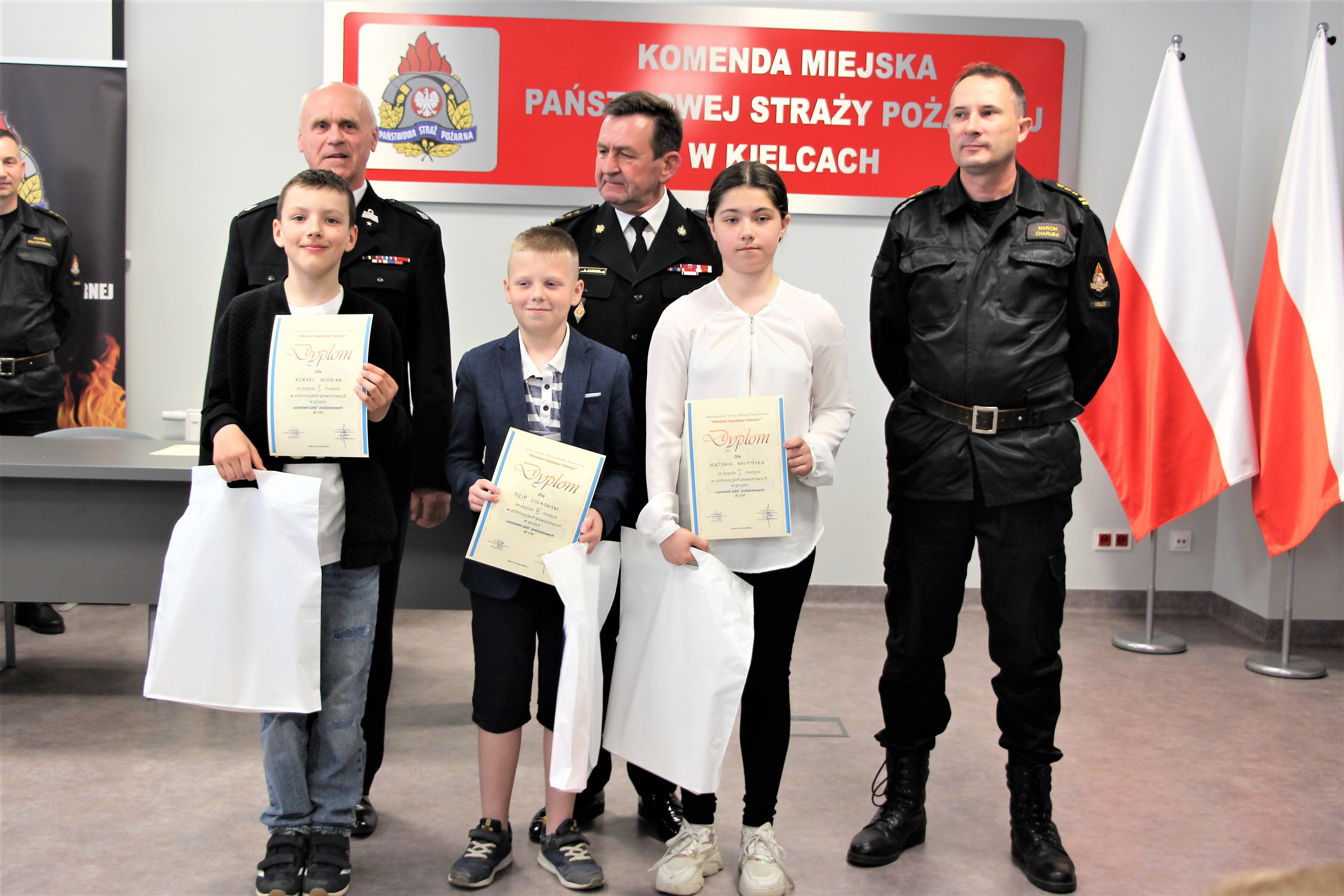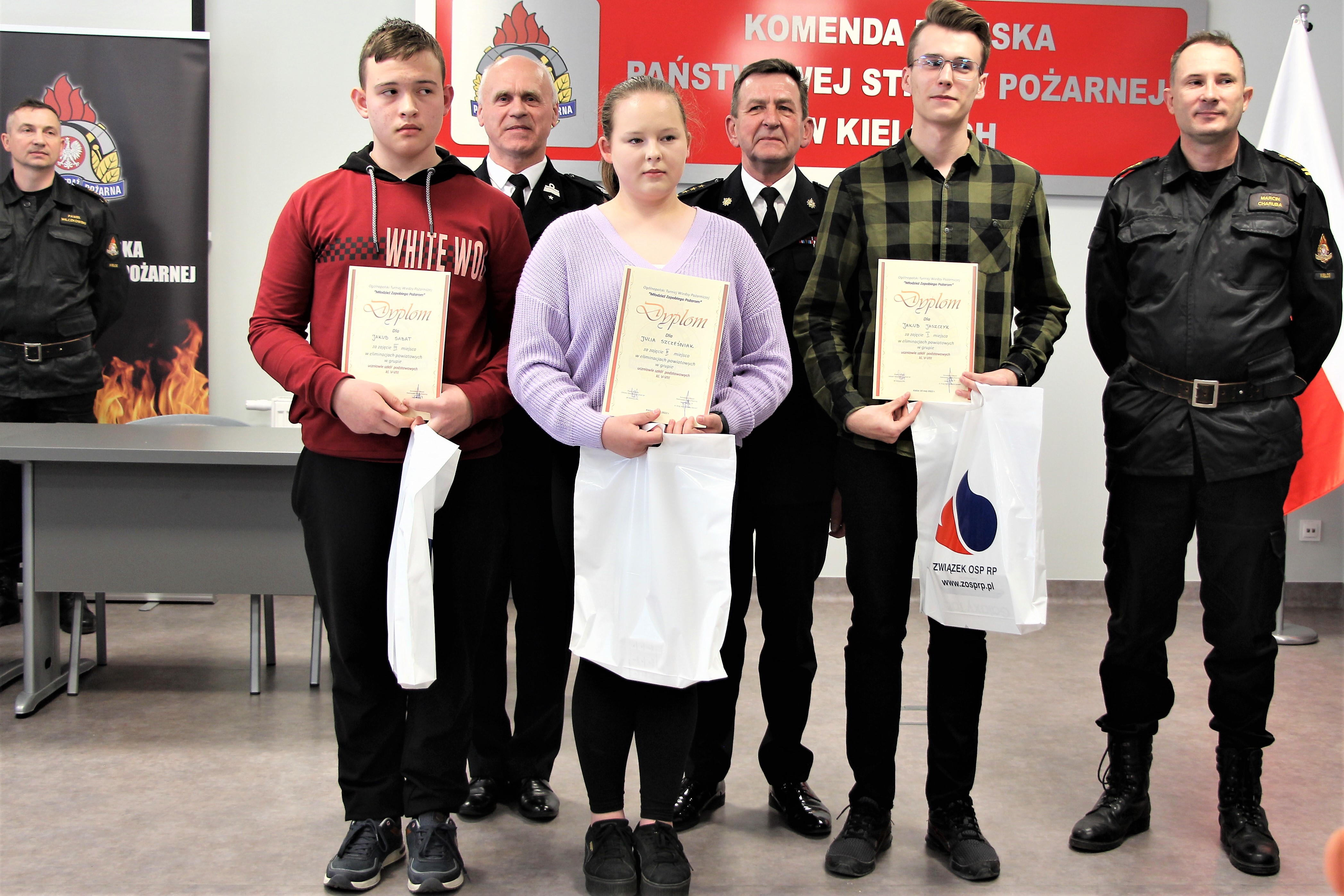 40-stu uczestników podzielonych na 3 grupy wiekowe: klasy 1-4, 5-8 i szkoły ponadpodstawowe pisali test z wiedzy pożarniczej, który wyłonił laureatów w każdej kategorii wiekowej. Zdobywcy pierwszego miejsca będą reprezentować nasz powiat w Ogólnopolskim Turnieju Wiedzy Pożarniczej na szczeblu wojewódzkim. Wszyscy uczestnicy otrzymali drobne upominki, a laureaci zostali nagrodzeni nagrodami rzeczowymi i dyplomami. Lista laureatów została przedstawiona poniżej: