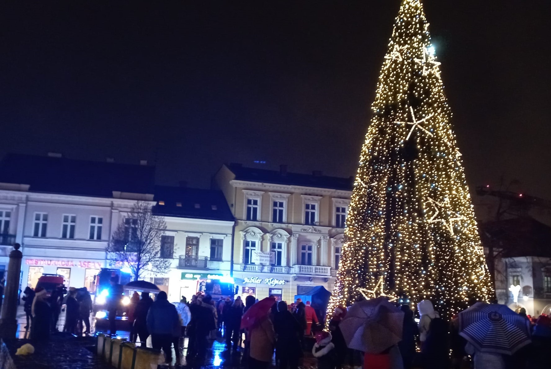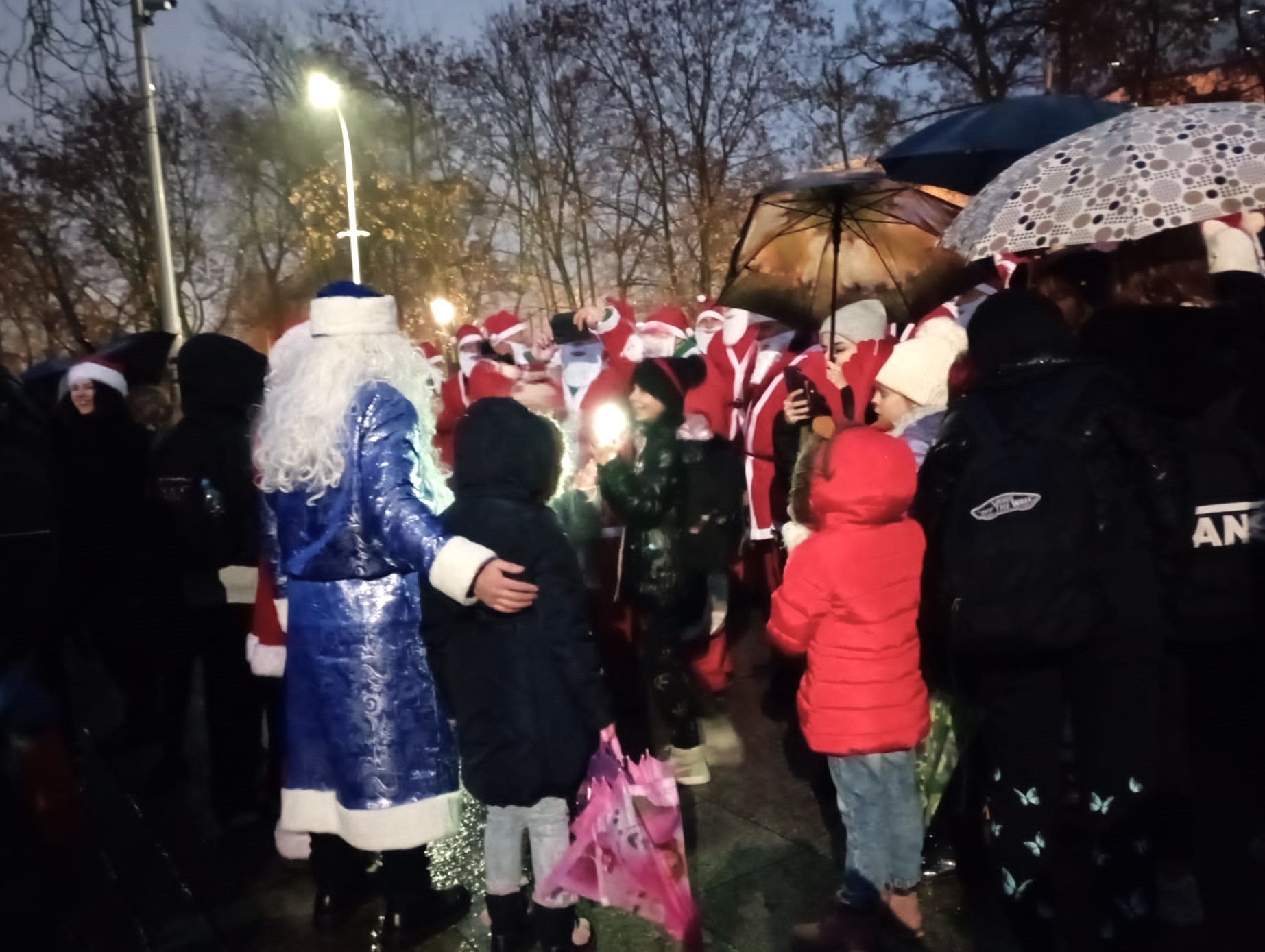 Zgromadziły się tu głównie dzieci i młodzież szkolna, która w towarzystwie przedstawicieli Urzędu Miasta, maskotek oraz reprezentantów instytucji w barwnym korowodzie przeszły świątecznie oświetlonym deptakiem na kielecki Rynek. Nie brakowało oczywiście tłumu Świętych Mikołajów w czerwonych strojach. Punktem kulminacyjnym tego wydarzenia było zapalenie dekoracji świątecznej na ogromnej choince dając znak, że rozpoczął się czas przedświąteczny. W tym spotkaniu z mieszkańcami uczestniczyła Państwowa Straż Pożarna, której stojący na Rynku samochód był jedną z atrakcji wydarzenia. Mimo nie sprzyjającej i wcale nie zimowej aury na płycie Rynku zgromadziła się ogromna liczba uczestników i nawet padający deszcz nie odstraszył tych, którzy cierpliwie czekali aż ustawiona na placu choinka zabłyśnie wszystkimi światełkami.