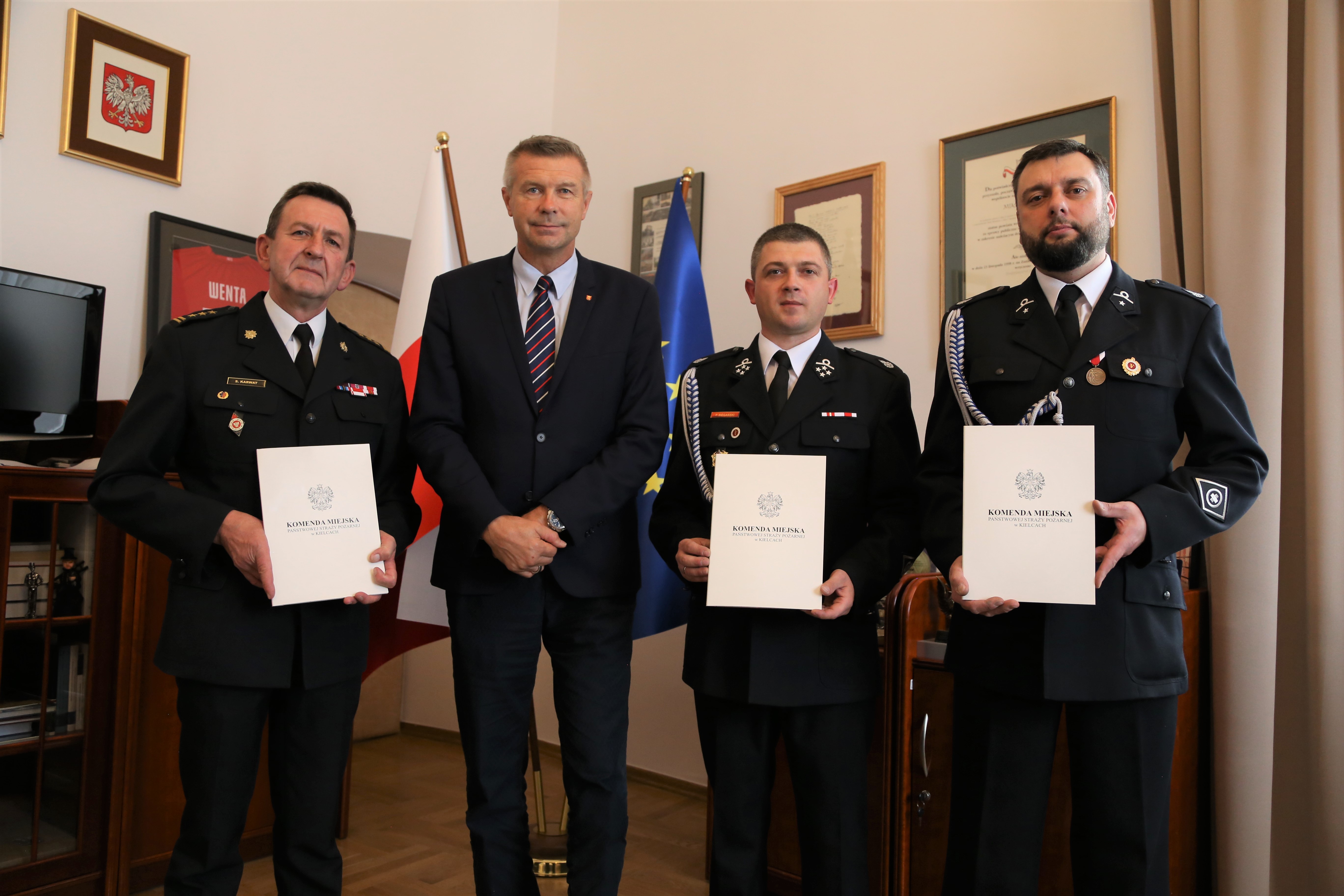 W dniu 14 września br., w siedzibie Urzędu Miasta Kielce miało miejsce podpisanie porozumienia o włączeniu do Krajowego Systemu Ratowniczo - Gaśniczego jednostki Ochotniczej Straży Pożarnej Niewachlów - Kielce. Trójstronne porozumienie zostało podpinane przez Komendanta Miejskiego PSP w Kielcach st. bryg. Sławomira Karwata, Prezydenta Miasta Kielce Bogdana Wentę, Prezesa OSP Niewachlow - Kielce druha Piotra Biegańskiego oraz Skarbnika druha Pawła Paciorka.