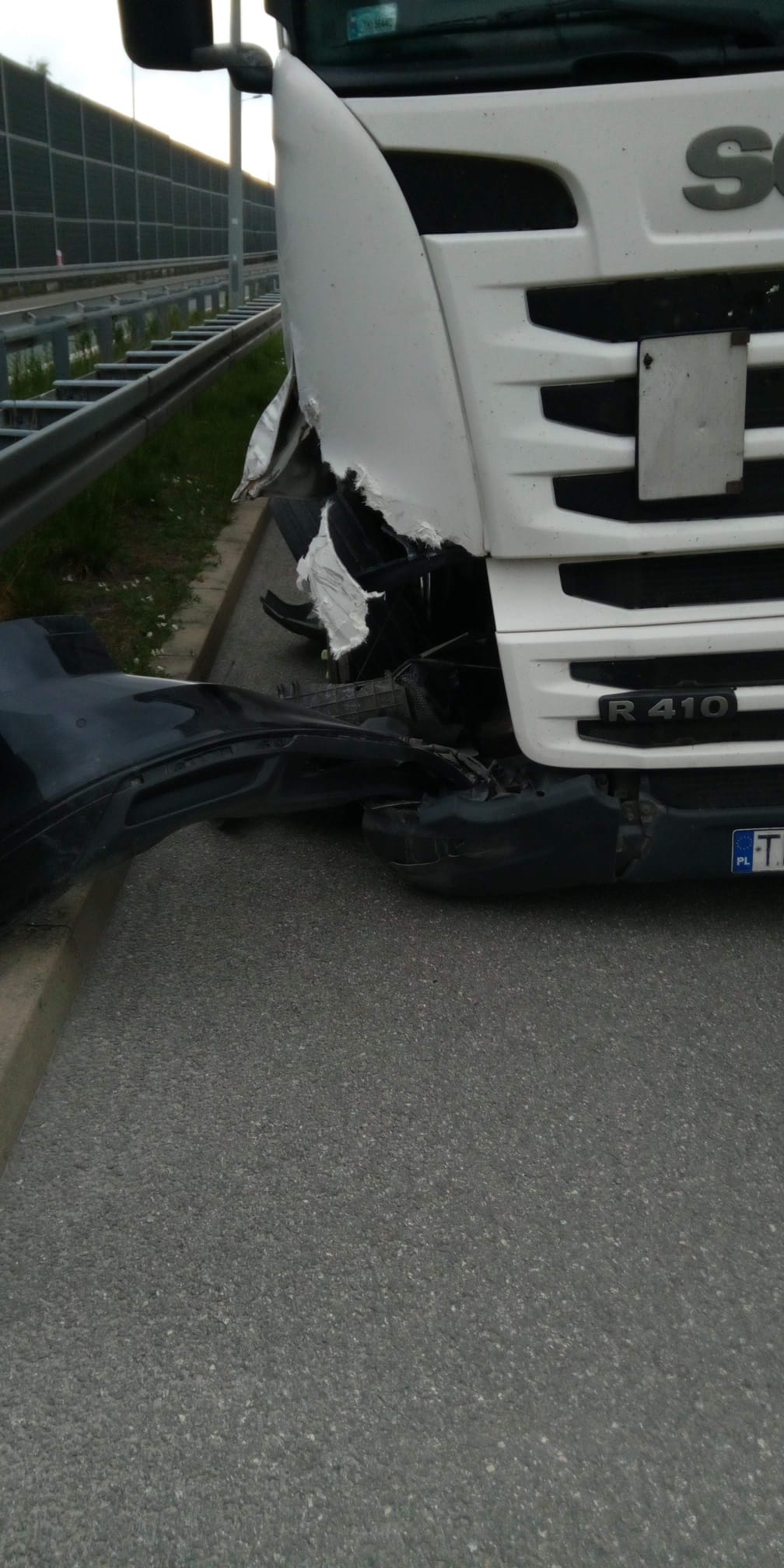 Na drodze ekspresowej S7 samochód Volkswagen Passat uderzył w barierę energochłonną, a następnie zderzył się z nim ciągnik siodłowy marki Scania z naczepą załadowaną kamieniem. W wyniku zdarzenia oba pojazdy zablokowały jeden pas ruchu w kierunku Krakowa. Pojazdami podróżowali tylko kierowcy, z których jedynie kierująca autem osobowym wymagała pomocy medycznej. Ratownicy zabezpieczyli teren działań wdrażając jednocześnie procedury kwalifikowanej pierwszej pomocy w stosunku do poszkodowanej. Kobieta, po przebadaniu przez Zespół Ratownictwa Medycznego pozostała na miejscu zdarzenia. Na zakończenie usunięto wycieki powstałe na jezdni.